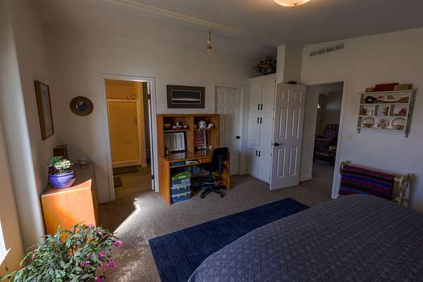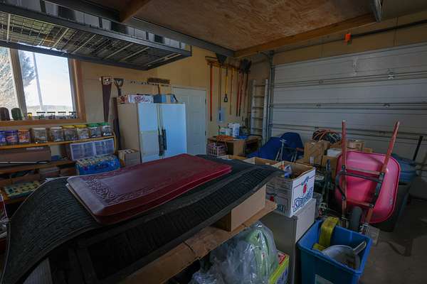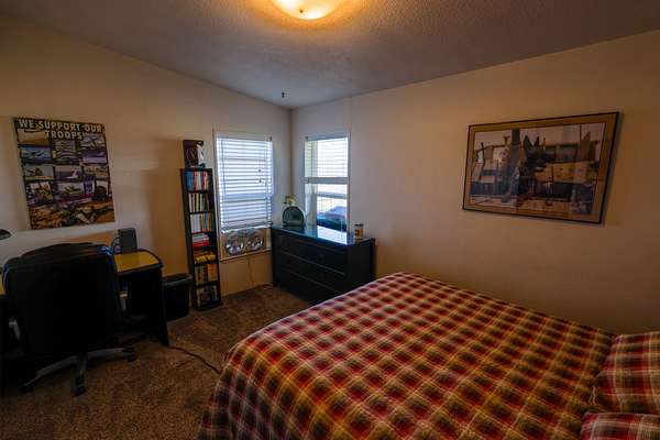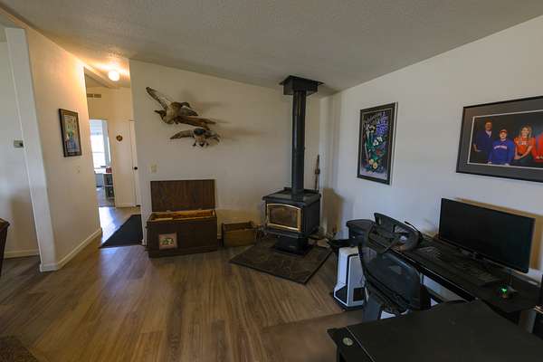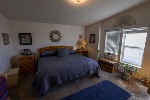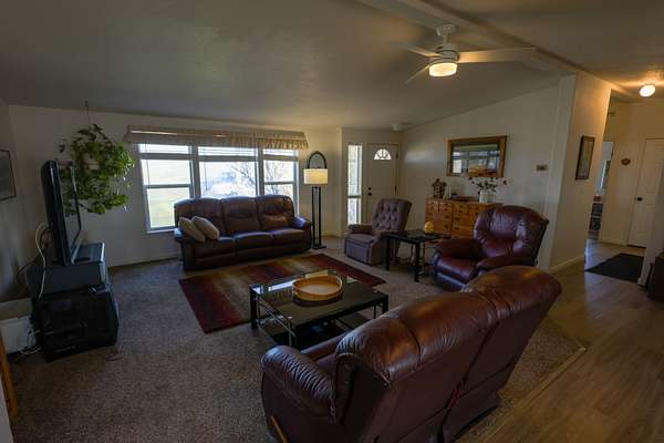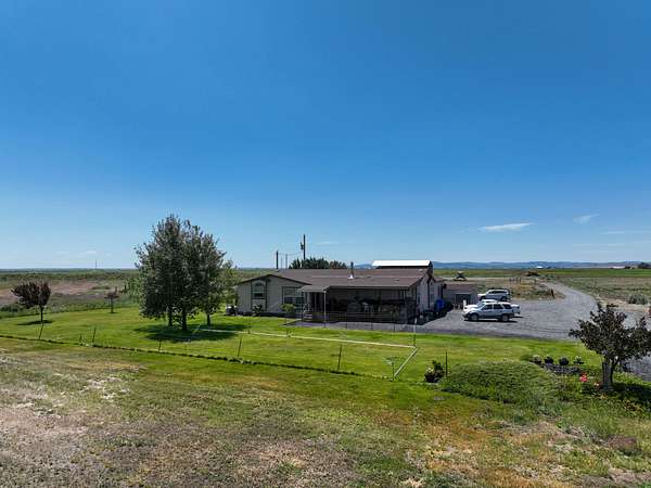The primary residence is a triple-wide manufactured home built in 1999. Upon the first approach, it presents as clean setup, featuring a spacious crushed rock driveway, charming landscaping including raised garden beds and mature trees, and a sizable lawn area. The house has a comp roof, T1-11 siding, vinyl windows, and a single-car garage. Both entrances to the home are covered, with the front entrance accessed by a concrete walkway and the rear entrance leading to a covered patio overlooking the basin.