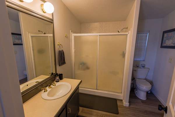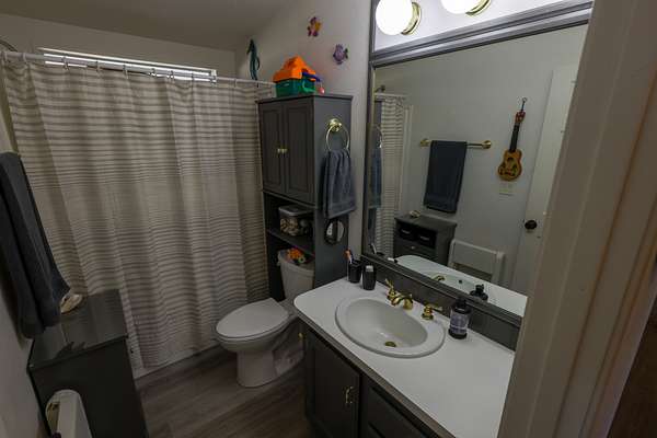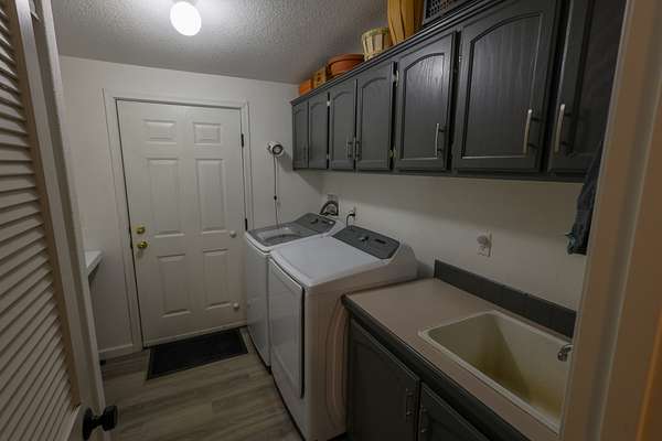 The two remaining bedrooms are situated on the opposite side of the home, featuring ample closet space & storage above. Adjacent to these bedrooms is a bathroom, conveniently accessible for guests and family members, equipped with vanity storage and an overhead cabinet with open storage above the toilet. A laundry room is positioned near the garage access, complete with additional overhead cabinets, countertop space, and a farmhouse sink.