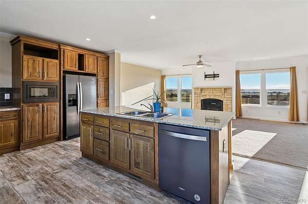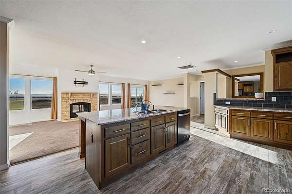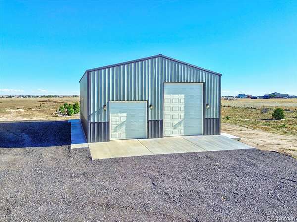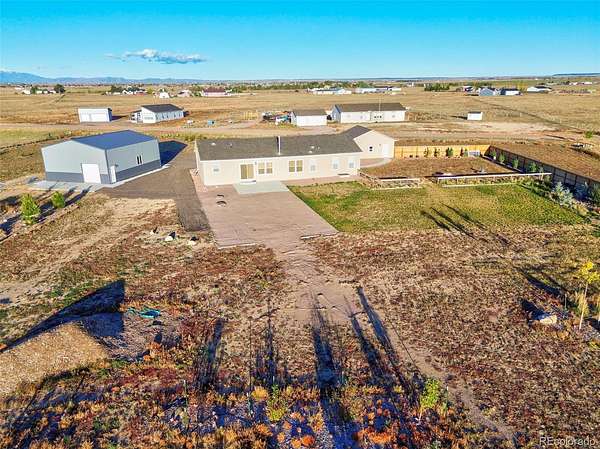 Breathtaking 5 ACRE rural property zoned for horses with views as expansive as the eye can see. This is a manufactured home built ADA compliant with two large detached garages with RV capacity. Driving up to the home an automatic solar gate with remote control provides access. The home and property have been well taken care of with attention being paid to the surrounding landscaping with a well manicured grass area, several sapling trees, bushes, and fences placed for privacy behind the home and along the property line. The home itself impress from the moment you walk in the front entryway beckons you in with a built in front table and coat storage closet. The home opens into the living and kitchen area that flows seamlessly together and basked in natural light flowing through the picturesque windows. The living room has a gas fireplace, perfect for those colder Colorado nights. The kitchen boasts a barstool height center island, gorgeous cabinetry and counter tops with ample storage and space, upgraded appliances, and space for a breakfast table. The home has four bedrooms with the primary being on one side of the home creating a private oasis with ensuite bath and walk in closet. The bath features a gorgeous modern tub, double vanity, and spacious stand alone shower.