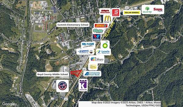 Prime Location - ±2.21-acre commercial development opportunity located along highly visible U.S. Route 60, just minutes from downtown Ashland and Interstate 64, providing excellent regional access. Highway Frontage & Visibility - Positioned along a high-traffic corridor with over 17,500 vehicles per day (VPD), offering outstanding exposure for retail, office, or service-oriented businesses. Dedicated median cut access to site. Dual Roadway Access - Property is Located with Significant Frontage on U.S. 60 & Summitt Road allowing for Easy Ingress/Egress for most Businesses! Unrestricted Zoning - Flexible zoning allows for a wide range of commercial or mixed-use development opportunities. Established Business Corridor - Surrounded by established businesses, restaurants, banks, and schools, generating consistent consumer traffic and strong potential for future ventures. Ingress/ Egress Opportunities- The Subject has one established point of entry utilizing US- 60 with the potential for an additional access point from Summitt Road. Clear Title- No Liens or Encumbrances- Title Insurance Available! Will Sell to Highest Bidder - Pre-Auction Offers Welcome - Online Bidding!