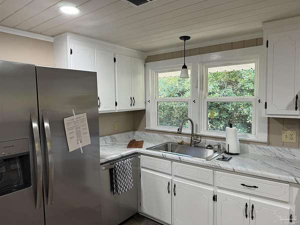 Century, FL - OWNER FINANCING AVAILABLE for 20 years with a small down payment! 3 Bedroom, 2 Bath Home on 5.35 acres, Completely Updated in 2023: all electrical, plumbing, new appliances with warranties, new deluxe vinyl sheet flooring, new recessed lighting throughout, new laminate countertops in the kitchen, new windows, and new interior/exterior doors! The plumbing was completely re-piped with PVC/CPVC and PEX pipes in 2014, and a new water heater was added in 2023. Built in 1933, the 1592 sqft layout has undergone a complete transformation with major renovations in 1980 and a complete update in 2023. The 3rd bedroom was thoughtfully added, enhancing the home's versatility. A cozy den seamlessly linked to the kitchen with charming brick steps offers an adaptable space for additional living space, a playroom, or entertainment hub. The kitchen was updated with new laminate countertops and stainless steel stove, refrigerator, and dishwasher. New recessed lighting throughout and deluxe vinyl sheet flooring in the kitchen, Back bathroom, laundry room with washer and dryer enhance the warm and inviting atmosphere. The original hardwood floors throughout the rest of the house showcase the home's timeless character, a nice plus for the master bedroom. The detached 2-car carport not only shelters your vehicles but also has a 300 sqft storage room that could be used as a workshop, living area, exercise room, or office. Seller has had a 4 Point Inspection completed, and it is uploaded as a document for your buyer's usage for Insurance. Located inside the city limits and just a short 45-minute drive from a casino, stunning beaches, this home offers both space and serenity with convenience. The generous amount of acreage offers plenty of useful space, whether it's a garden or for friends and family to visit in their RV. This move-in ready home is waiting for you to make it your forever place! Call to schedule a viewing today!