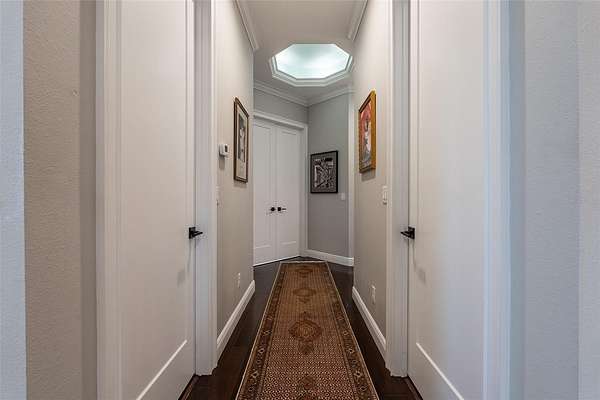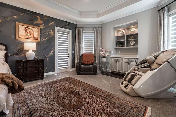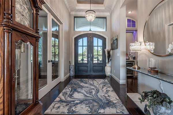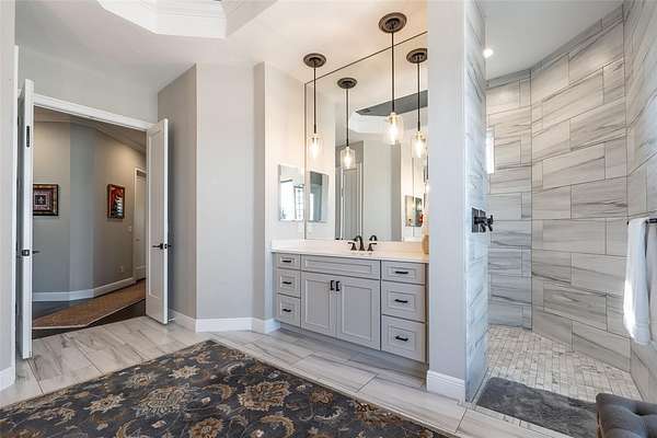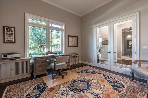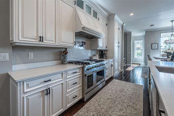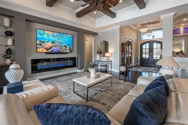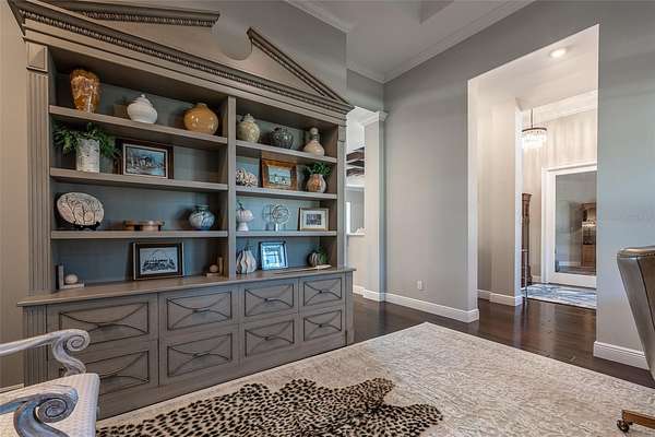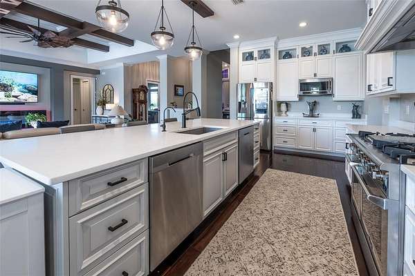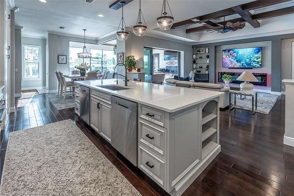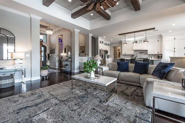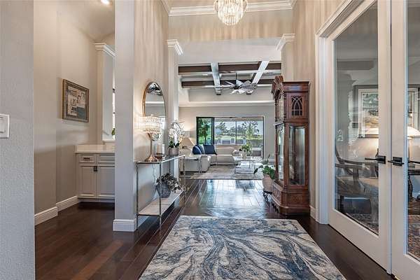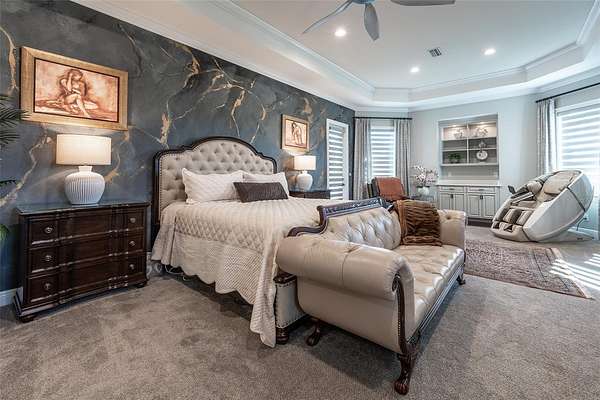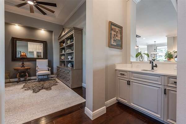 - Built-In Features, Ceiling Fans(s), Coffered Ceiling(s), Crown Molding, Eat-In Kitchen, High Ceilings, L Dining, Open Floorplan, Primary Bedroom Main Floor, Solid Surface Counters, Solid Wood Cabinets, Split Bedroom, Stone Counters, Tray Ceiling(s), Walk-In Closet(s), Wet Bar
