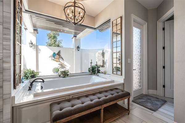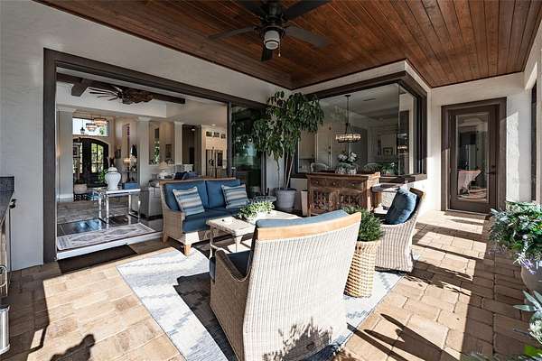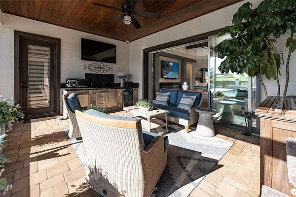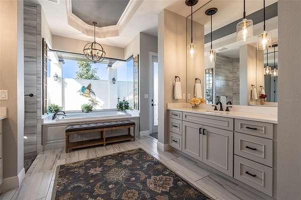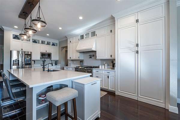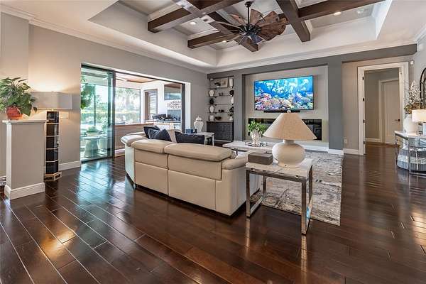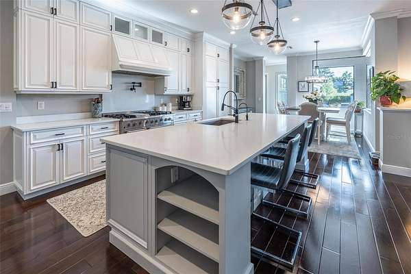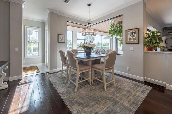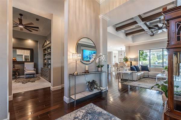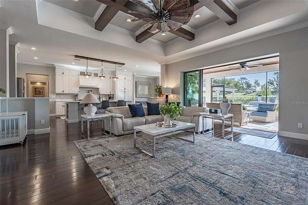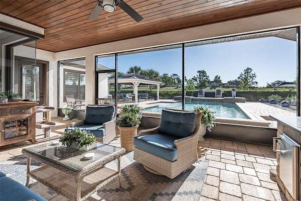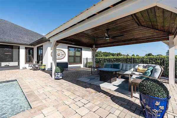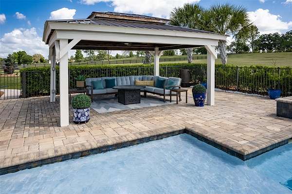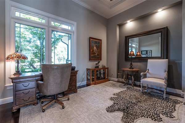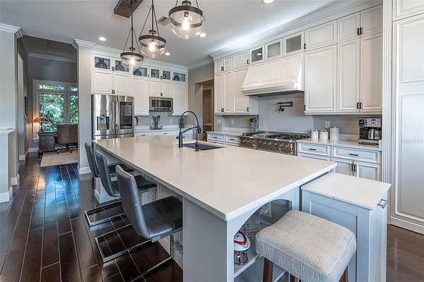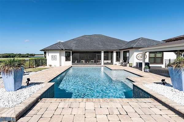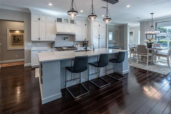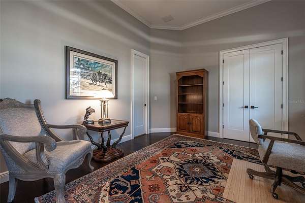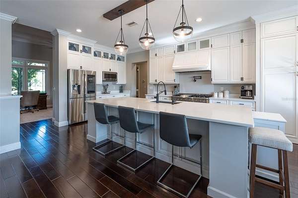 Amazing Home sits high on Hill with beautiful curb appeal. Gated Entrance and Paver drive leads to welcoming landscaped entry. Heavy Duty castle like door opens to impressive Entry. Large Great Room features beamed ceiling and windmill fan and wood Oak wide plank floors. Fireplace built with electric flame gives of heat and appealing mood lighting. See resort style pool through stackable sliders that invites relaxation and recreation. Dream Kitchen has large island with bar seating and storage. Upgraded wooded Cabinets are white and tall with lighted high uppers for display. Thor Gas Range features center griddle and heavy duty range hood that vents to outside. Convenient pot Filler water at range Plenty of Storage with so many cabinets and walk in large Pantry. Two dishwashers and double oven, and smart Refrigerator. Many rooms offer versatality for your particular uses. Formal dining room off of kitchen presently being used for office. Has butlers station with mini sink and wine fridge with lighted cabinetry can also be used for guest welcome center or coffee station as well. His and her offices at entry with large windows looks over the front yard grounds. Corridor leads to Master wing featuring large bedroom with tray ceiling, beautiful window treatments, custom accent wall. Entry door to pool area. Master has a bonus room for dressing room, private office, or exercise, or hobbies. Separate walk-in closet as well. Dream Bath features high ceilings with surround window that looks to private, covered, outdoor court yard. Large soaking tub is not jetted. His and her vanities, spacious floor to ceiling tiled shower with rain head, standard shower head, and tiled bench. Triple split bedroom plan offers bedroom with it's own bath and another multi purpose room and entry to pool area. Additional two bedrooms have large closets and share a luxurious bath with shower. The Screened Lanai has summer kitchen with another beverage fridge and television great ambiance looking out at the grounds and the pool area. Resort style pool has Gazebo with inviting high quality outdoor futniture and fire pit. Salt water pool is large and has lounge chair deck. Night time is amazing with pool light and another step up seating area with fire place. Another separate hall from the kitchen leads a large laundry room with light shining windows, sinks and cabinetry. Continue to shoe and coat station off the spacious three car garage. Large paver driveway allows for lots of parking and easy vehicle turning. Generator in place 22 KW. Yard is irrigated and beautifully landscaped. Location is ideal and close to everything.