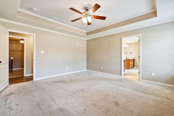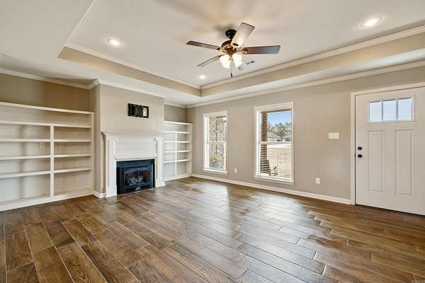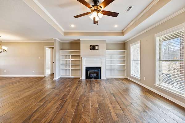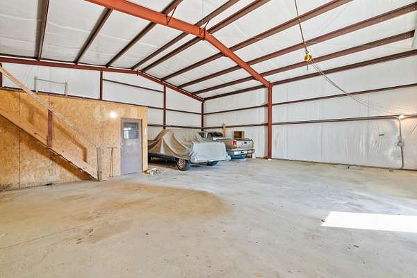 HOME ON 3 FLAT ACRES WITH HUGE SHOP! This beautifully maintained home offers elevated country living with a peaceful wooded backdrop. The open living area features tile flooring, custom built-ins, and a propane gas fireplace, flowing into a well-appointed kitchen with granite countertops, stainless steel appliances, double oven, and refrigerator that conveys. A split floor plan provides privacy, while the laundry room is thoughtfully designed with a sink and folding table. The primary suite is a true retreat with double vanities, jacuzzi tub, walk-in shower, and walk-in closet with a built-in wall safe. Enjoy the large covered porch, plus a new roof in 2023, brand-new hot water heater, and full guttering. The 42x40 Red Iron shop is equipped with electricity and plumbing, includes an interior workshop, and offers two bays--one oversized and ideal for RV parking. This rare find won't last long!