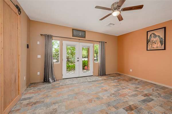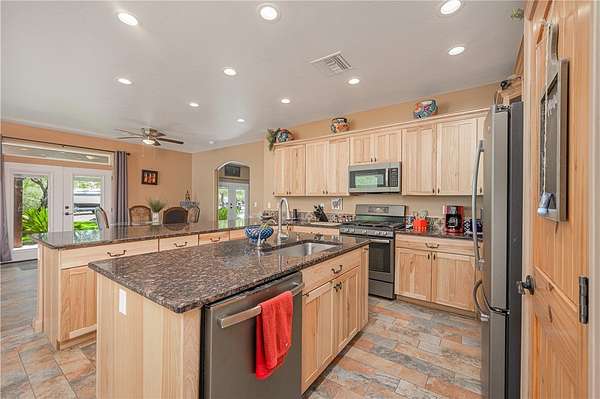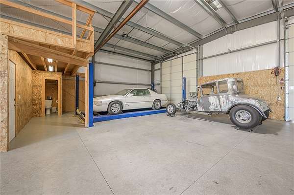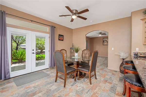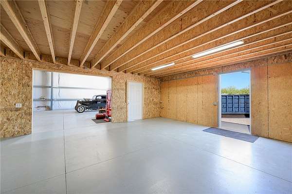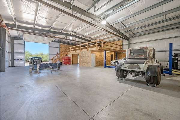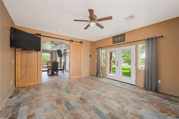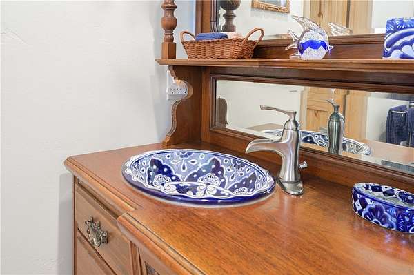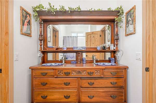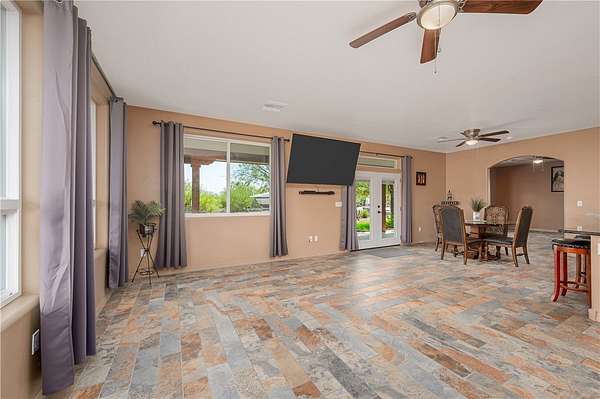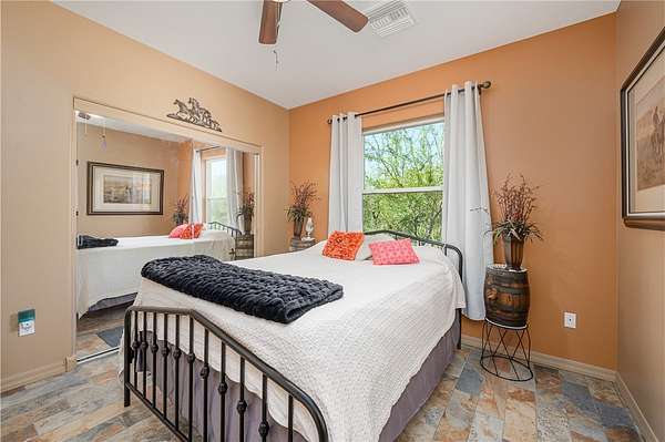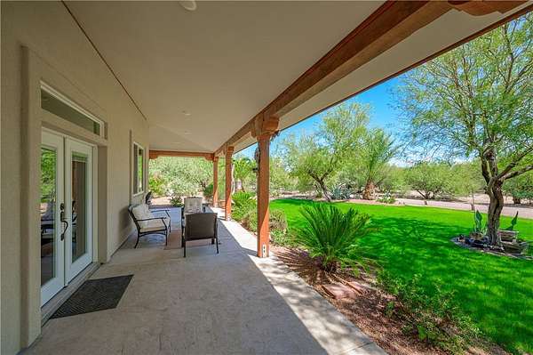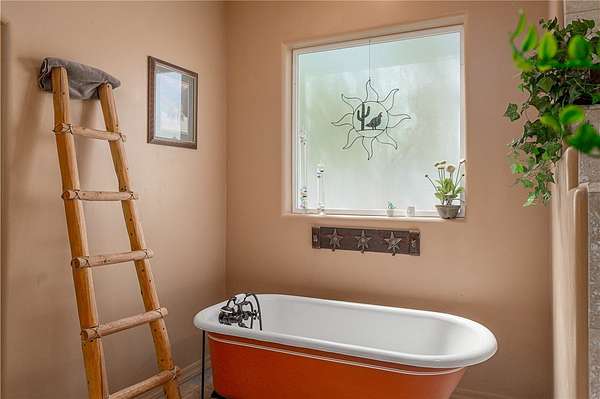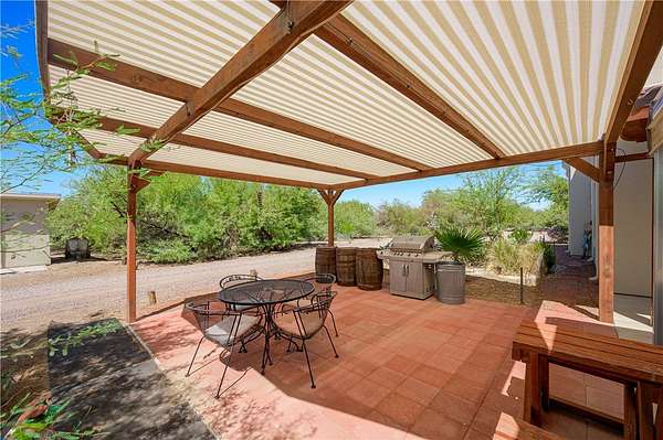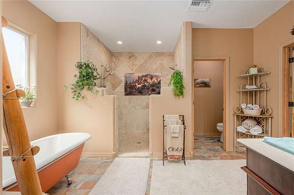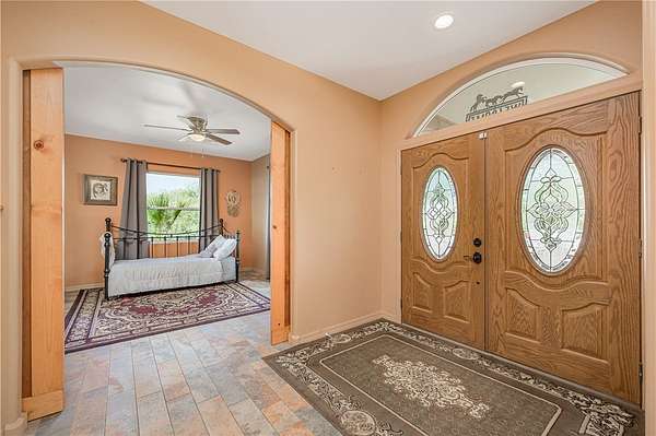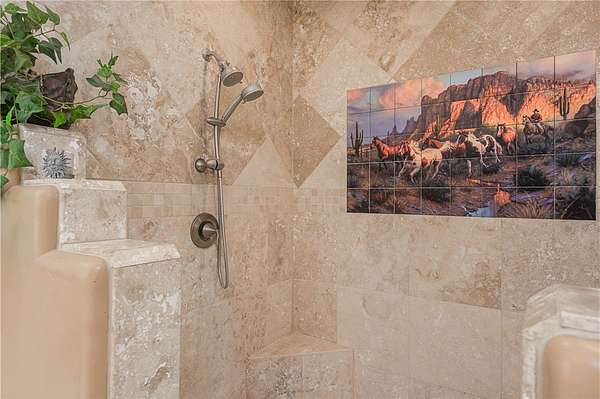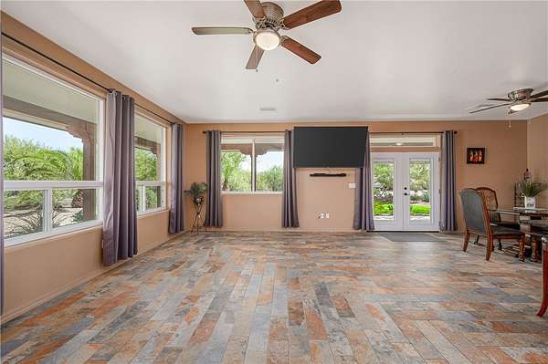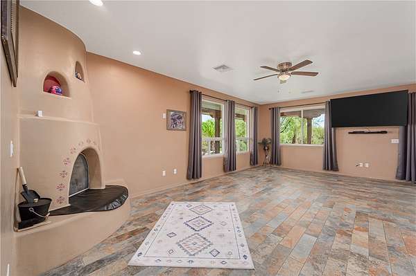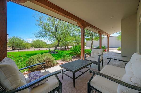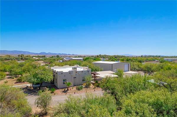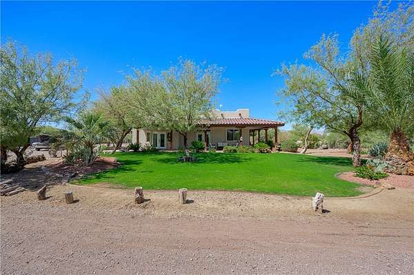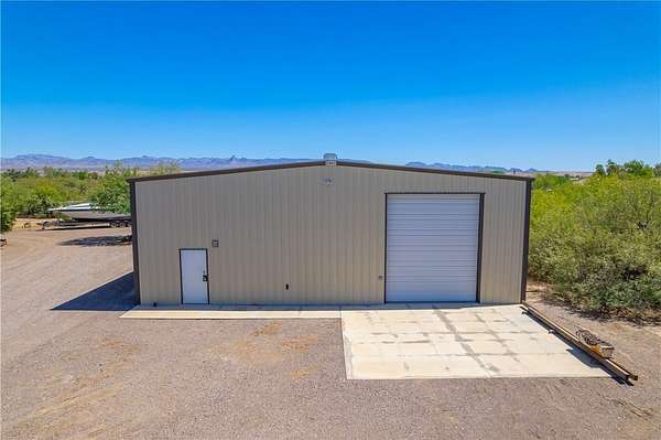 Experience true desert living on 2.5 acres with this 2018 adobe-style home, blending rustic charm and modern upgrades. Featuring 3 bedrooms, 3 bathrooms, and a spacious great room with a wood-burning Kiva fireplace, the interior showcases solid wood doors, glazed porcelain tile throughout, hickory cabinetry, granite countertops, and GE Adora appliances. The primary suite offers a spa-like retreat with a custom dual-head tiled shower with desert mosaic, claw-foot tub, custom wood vanity, and a large walk-in closet. Outdoors, enjoy a wrap-around lighted and covered porch with stamped concrete, lush grass with full irrigation, and a circular driveway. Guests are accommodated with a 45' RV pad with full hookups plus two additional RV connections. The impressive 3,000 sq ft detached insulated steel building boasts three 12 x14 insulated bay doors, a large loft, enclosed workshop, half bath, overhead 1-ton crane, and 50-amp RV hookup perfect for storage or hobbies! Fully fenced and gated, this property combines privacy, functionality, and high-end features for a one-of-a-kind Mohave Valley retreat!