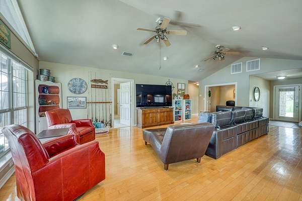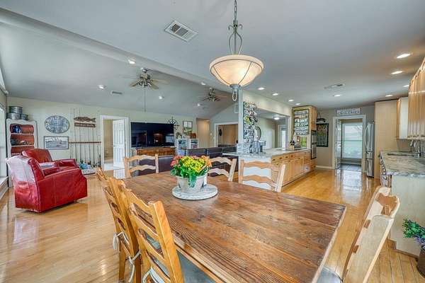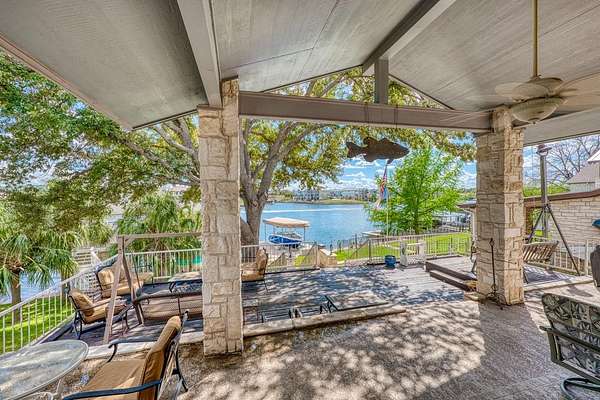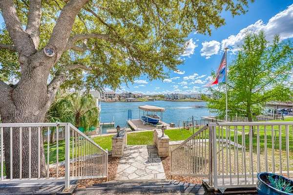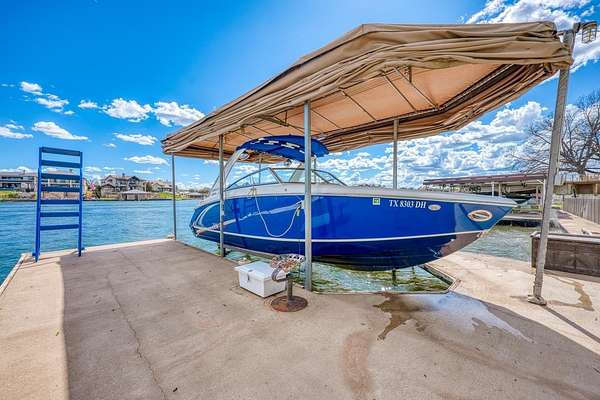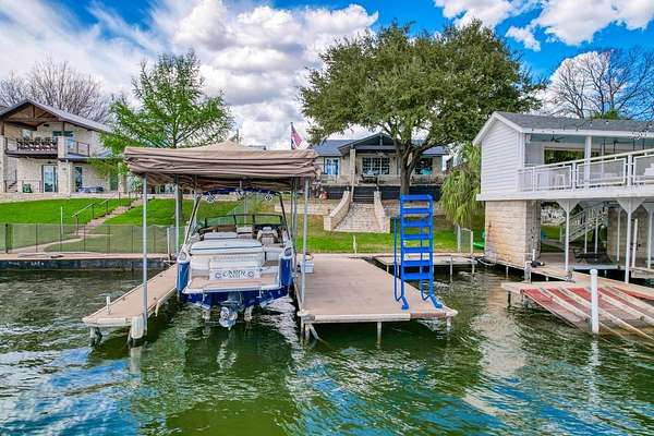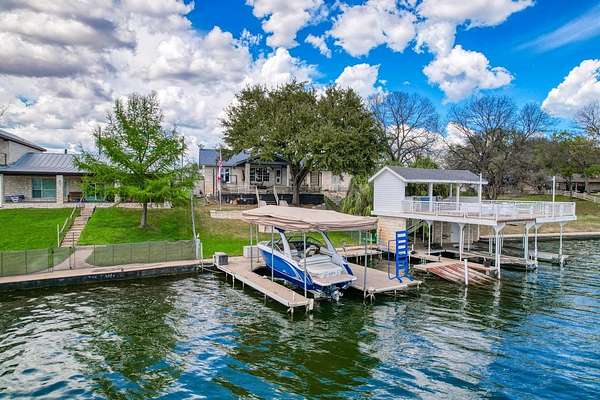 Welcome to prime waterfront living on beautiful Lake LBJ, where sweeping open-water views and relaxed Hill Country lake life come together. This beautiful south-facing 3-bedroom, 2-bath home with a dedicated study captures the relaxed elegance of the Texas Hill Country lake lifestyle. Large windows invite natural light and frame tranquil lake views, creating an inviting atmosphere ideal for both everyday living and entertaining. The flexible study offers the perfect space for a home office, reading room, or additional guest accommodations, while the comfortable layout allows family and friends to gather with ease. Step outside and experience the true magic of lake life. A gorgeous patio and deck create an exceptional outdoor living space, perfect for entertaining, sunset cocktails, and taking in the stunning open-water views. This property also features a brand-new hydraulic boat lift and deep water, perfect for swimming, fishing, and effortless days on the lake. Imagine mornings with coffee overlooking the water, afternoons spent out on the lake, and evenings watching the sunset reflect across the open water. Whether you're searching for a full-time waterfront residence, a perfect weekend retreat, or a turn key short term rental, this property offers endless opportunities to experience lake life at its fullest. *Bonus: City sewer = no hassle of septic system!