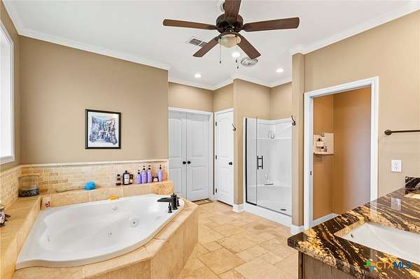 - All Bedrooms Down, Attic, Built In Features, Cathedral Ceilings, Ceiling Fans, Elevator, Granite Counters, Jetted Tub, Kitchen Dining Combo, Kitchen Family Room Combo, Kitchen Island, Main Level Primary, Pantry, Primary Downstairs, Recessed Lighting, Separate Shower, Vaulted Ceilings, Walk In Closets, Walk In Pantry