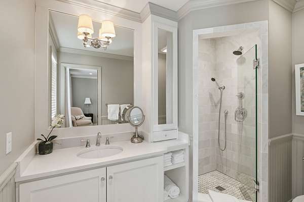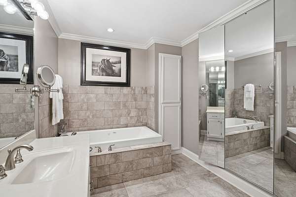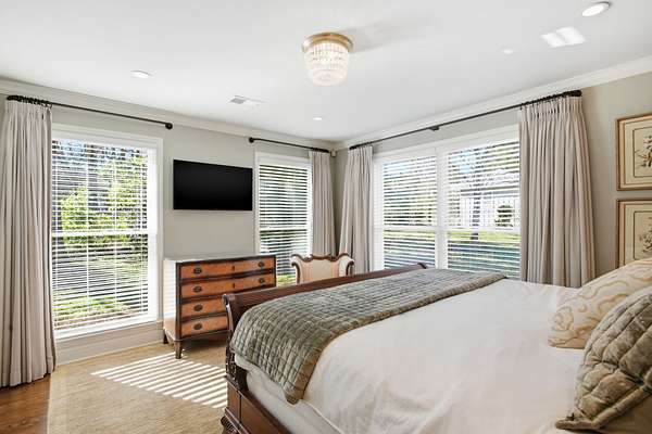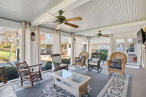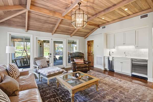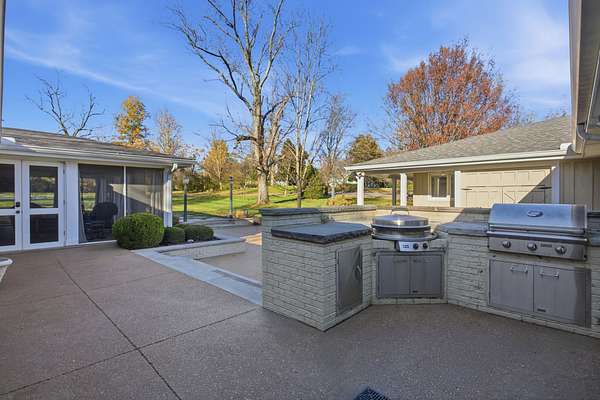 Situated on two gated acres, this residence offers highly sought-after one-level living with an exceptional floorplan designed for ease and flow. The open floor plan features hardwood floors throughout and generous living areas, including a kitchen with scullery that opens to the main living room with a wet bar and ice maker. Additional spaces include a den with an adjoining sunroom, a dedicated homework or office nook, and five bedrooms, each with its own private bath. Designed with everyday living in mind, the home also includes a private workout room with sauna and a built-in dog wash. Outdoor living is a highlight, with a screened-in porch, covered patio, outdoor kitchen, and sports court creating multiple areas for entertaining and relaxation. A heated and cooled shed adds versatile bonus space for storage, hobbies, or a studio. Buyer to verify all information.