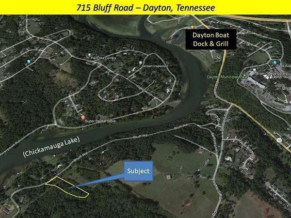 From Chattanooga - Take 4 lane Hwy 27 NORTH to Dayton. Turn RIGHT on Hwy 30 (toward Decatur) Turn Right on Double S Road Turn Right on Bluff Road to 715 Bluff Road.