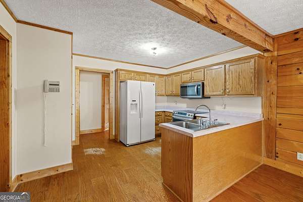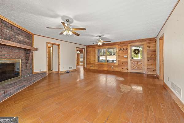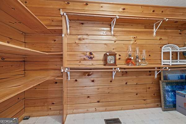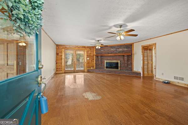 Tucked away on 20.35 wooded acres, this log cabin offers privacy, rolling hills, and peaceful natural surroundings. A long driveway leads to the home and provides a private setting. The home features one-level living with an unfinished basement. A covered front porch welcomes you home and creates a quiet place to slow down-ideal for rocking chairs and taking in the sounds of nature. The family room features a fireplace, wooded views, and double French doors leading to a covered porch/deck for outdoor living. The primary suite includes double French doors opening to a private deck-an ideal spot to enjoy the surrounding woods. The split-bedroom floor plan offers two additional bedrooms and a shared bath on the opposite side of the home. Eat-in country kitchen with pantry. Fenced backyard for children, pets, or everyday outdoor enjoyment. Mostly wooded with a small creek. Located just 2 miles from Interstate 85, this property offers the rare combination of privacy, acreage, and convenience-well suited for buyers seeking a full-time residence or private retreat with room to grow. This home offers a solid foundation for someone ready to make it their own.