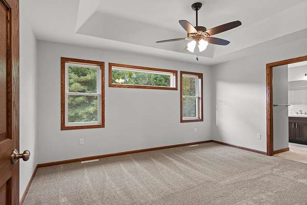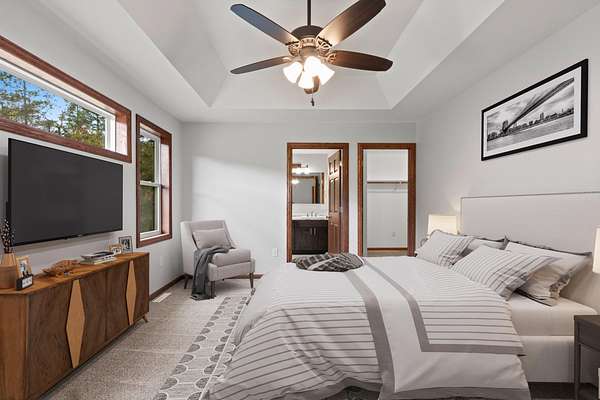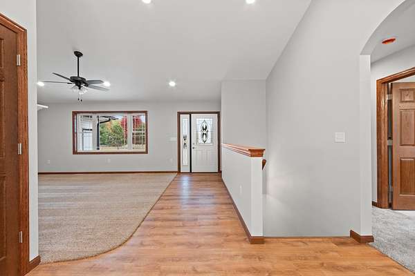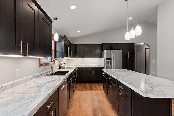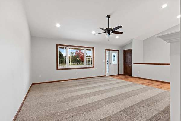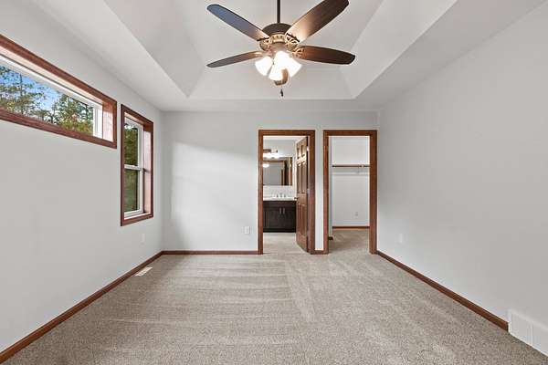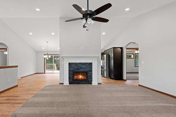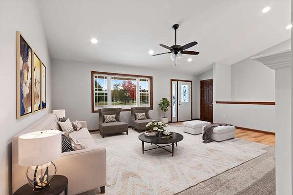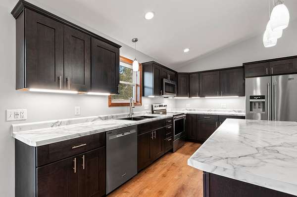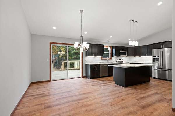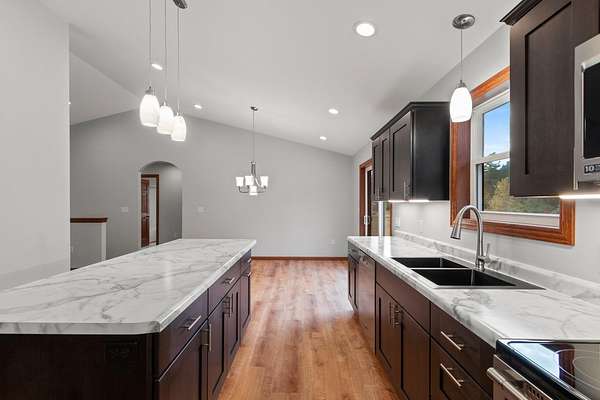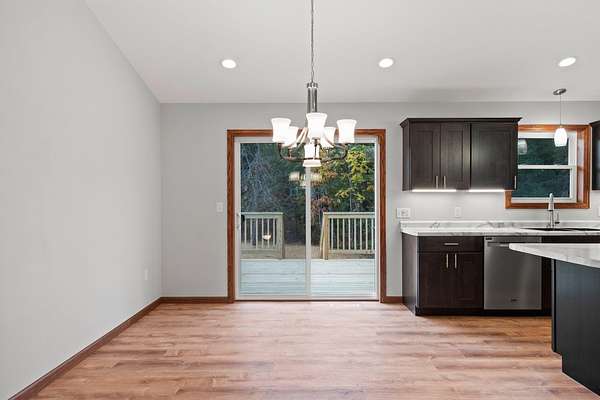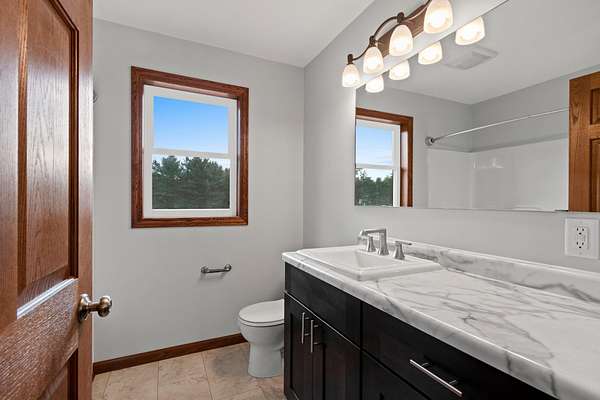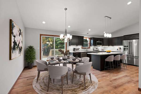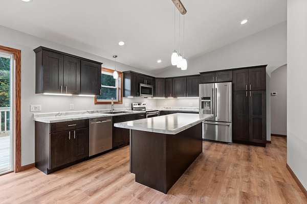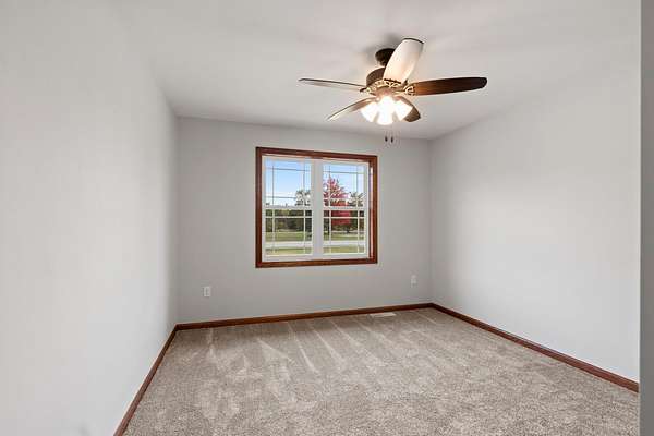 Fantastic new construction with a lot of extras that you'll love! Already completed is a wonderful deck, seeded yard, finished garage w/ one stall double deep. There is room on this 1.8 Acre lot for an outbuilding and no restrictive covenants. You'll appreciate the location being close to the city, hospital, school, stores, and easy highway access. This home features a split bedroom design, airy vaulted ceilings through the living space, first floor laundry, a large center island, SS appliance package, a primary suite w/ bathroom & Walk-in closet, living room w/ gas fireplace and a large open concept basement w/ egress windows and stubbed for bath, offering a blank slate to finish as you'd like. Book your showing today! 48hrs binding acceptance required, some photos virtually staged.