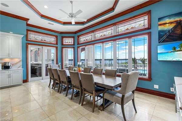 The home offers six ensuite bedrooms, 9.5 total baths (primary bath has 3 bathroom sections but counted as 1 in the total), a library with wet bar, a media/family room with projector, fitness and meditation rooms, and rooftop terraces designed for sunset and Gulf views. The chef's kitchen features dual islands, Sub-Zero and Wolf appliances, wine fridge, ice maker, and walk-in pantry, flowing seamlessly into both formal and casual dining areas. The primary suite includes bay views from a private screened terrace, fireplace, sitting area, spa-like bath, and custom closets, while guest suites offer private balconies, walk-in closets, and baths.