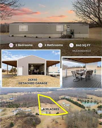 6.39 ACRES- Escape to your own slice of lake-country paradise! This 2018 2-bedroom, 2-bath mobile home sits on 6.39 beautiful acres and offers the perfect blend of privacy, recreation, and convenience. The home comes equipped with kitchen appliances and some furnishings, plus a covered back deck-ideal for relaxing after a day on the lake. Outside is where it just keeps getting better! You'll find a 24x40 detached garage w/ 14ft tall door with covered lean-tos on each side, complete with concrete floor, 200-amp service, and two 50-amp and 30-amp camper hookups-perfect for storing boats, ATVs, equipment, or setting up a workshop. There's also a 10x20 insulated storage building and an additional RV hookup near the driveway, making it easy to host campers or guests. The back portion of the property features wooded acreage with ATV trails, offering space to explore and enjoy the outdoors. Located within minutes of multiple boat ramps, you'll have quick access to Lake Cumberland, including the Faubush Creek area, with just a short boat ride across the water to Conley Bottom Marina. Whether you're searching for a full-time residence, weekend getaway, or recreational investment, this property checks all the boxes-acreage, lake access, RV capability, and serious shop space. Bring your boats, campers, and big dreams-lake life starts here!