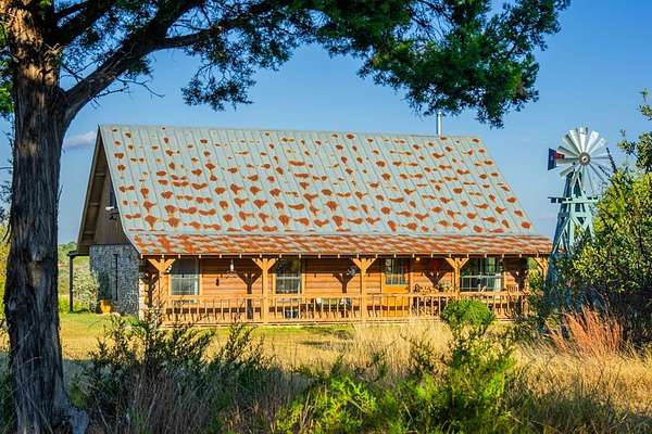 Tucked away along a quiet county road, this 10+/- acre Hill Country retreat offers privacy, native landscape, and charming rustic living just minutes from town. The 1B/1B cabin features an open-concept layout with vaulted ceilings, wood interiors, and a cozy living area centered around a wood-burning stove. A spacious sleeping loft overlooks the main living space and provides additional room for guests, office use, or a peaceful reading nook. The kitchen includes generous cabinet storage and a functional layout that keeps the living and dining areas connected. Built in 1990 and offering 1,540 sq. ft., the home is designed for comfort without sacrificing simplicity. A 28x32 covered back porch expands the living space outdoors, capturing hilltop breezes and wide-open views--perfect for morning coffee, evening wine, or quiet afternoons surrounded by nature. The cabin sits behind a chip-seal driveway that winds through native trees, giving the property a true sense of seclusion while maintaining easy access to Hwy 290 less than a mile away. A 25x30 garage/barn provides covered parking for two vehicles, feed, tools, or equipment storage. A private water well (2 GPM) and septic system are in place, along with a water storage tank for added capacity. CTEC electric service is on site, and the property offers ample space for gardening, livestock, hunting, or additional structures if desired. Located just 12 minutes (9.2 miles) from downtown Fredericksburg and 17 minutes (15.6 miles) from Harper, the property strikes a perfect balance between rural solitude and nearby amenities. Whether you're looking for a weekend escape, full-time country living, or a cabin with room to expand, this peaceful Hill Country hideaway is ready to enjoy.