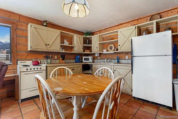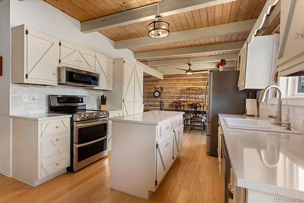 The heart of the home showcases classic log construction with exposed beams and tongue and groove ceilings, creating a warm, grounded mountain feel. Large windows bring in natural light and frame the surrounding views. The kitchen has been updated with light cabinetry, solid surface counters, and a central island, opening into the dining and living areas for a practical, easy flow.
