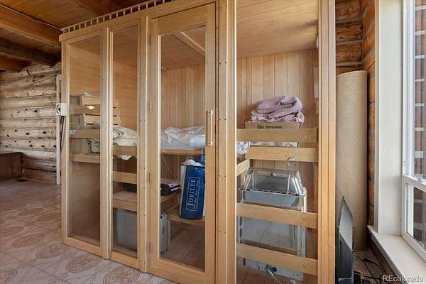 Additional features include multiple living areas, a wood burning fireplace, sauna, and a mix of wood, tile, and carpet flooring that fits the character of the home.