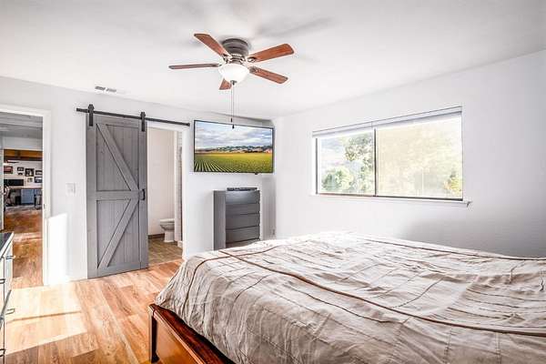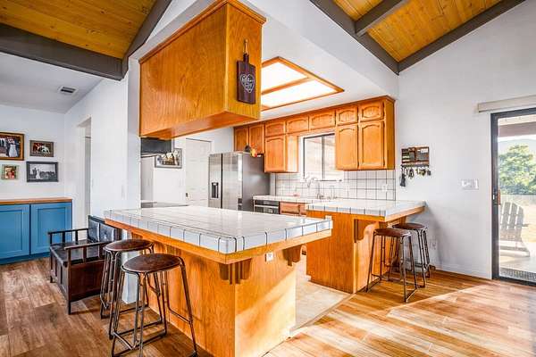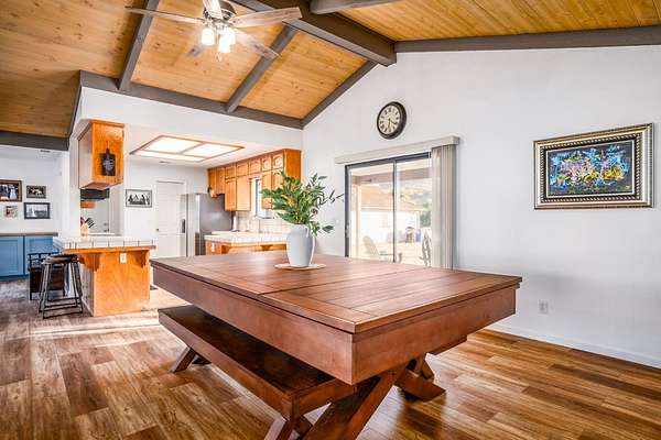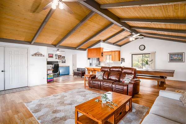 Welcome to the peaceful beauty of Wonder Valley Ranchos in Sanger! This spacious 2,360 sq. ft. home offers 3 bedrooms, 3 bathrooms, plus a versatile bonus room perfect for a home office, game room, or creative studio. Inside, you'll be greeted by stunning tongue-and-groove knotty pine ceilings with exposed hardwood beams, a cozy brick fireplace with extended seating, and brand-new luxury vinyl plank flooring throughout. An 85-inch wall-mounted TV is also included! Comfort comes easy with a brand-new HVAC system and ducting, while a whole-house water filtration system ensures fresh, clean water year-round. The kitchen is well-positioned between the bonus room and dining area, featuring countertop bar seating, a breakfast nook, pantry storage, and a picture window with views of the seasonal creek and rolling hills. A defined office space just off the kitchen overlooks the front of the home. The fully fenced property with 360-degree views and plenty of room to roam. The impressive 40x40 detached shop provides ample space for RV storage, EV charging access, 2 car garage, and even includes a full bathroom with shower ideal for hobbies or guest use. Owned solar delivers valuable energy savings on NEM-2, while the location offers quick access to the historic Wonder Valley Resort, the Kings River, and Pine Flat Lake perfect for boating, fishing, and outdoor adventures. In this open-range community, don't be surprised to see cattle, and horses roaming freely, adding to the area's rustic charm. Discover your own private retreat in Wonder Valley Ranchos where country living meets modern comfort.