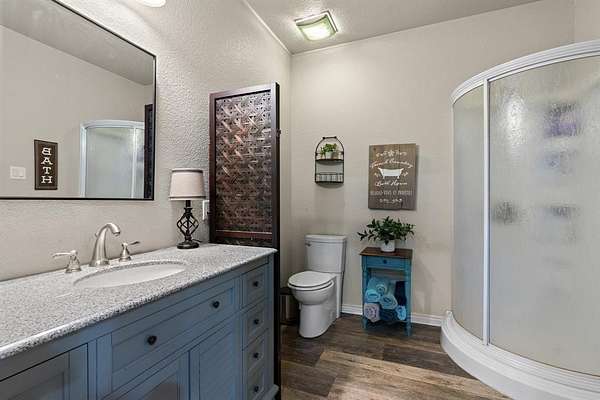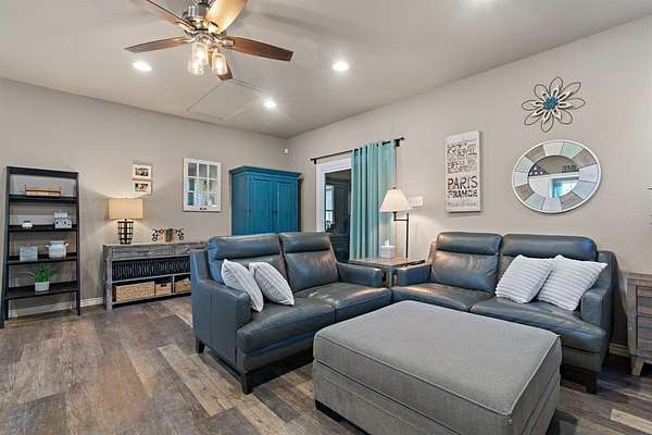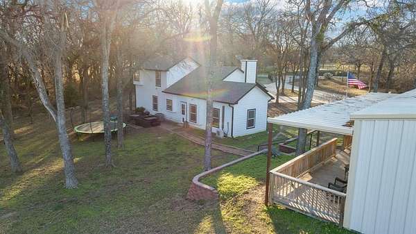 Welcome to your private Texas retreat on 6 quiet, fully fenced acres. Tucked behind an electric gate, this property offers room to breathe, play, and expand; whether you dream of building a second home, riding dirt bikes, or simply enjoying peaceful country living. The main home features 3 bedrooms + a bonus room that works perfectly as an office or additional bedroom, along with 2 full bathrooms and cozy living room for family time. Just steps away, the shop includes a full guest suite complete with a bedroom, full bathroom, kitchen, private living space, and even additional laundry hookups; an ideal setup for guests, a man cave, multigenerational living, or rental potential. Outside, you'll love the circle drive, the open land ready for animals or adventures, and the quiet, tucked-away feel while still being close to town conveniences. A rare blend of privacy, versatility, and acreage; this property is ready to become whatever you imagine next.