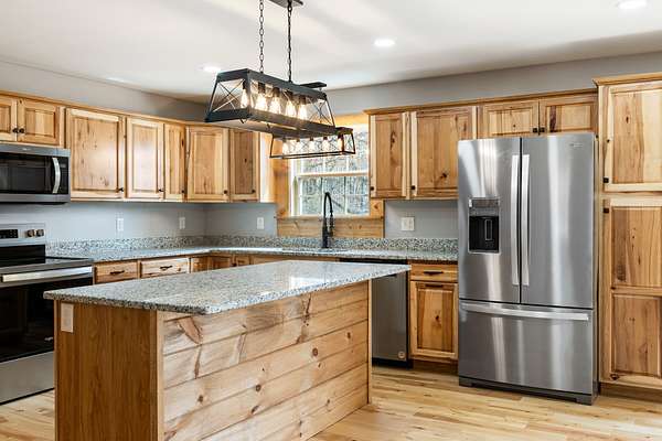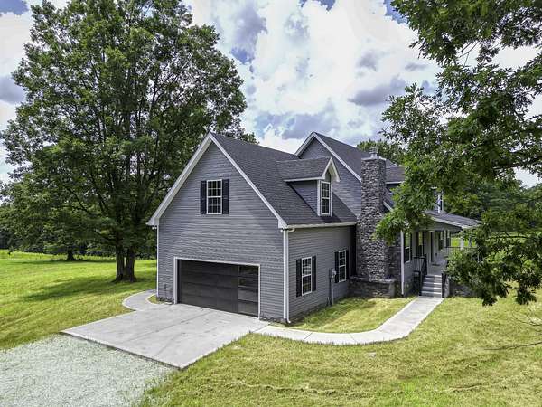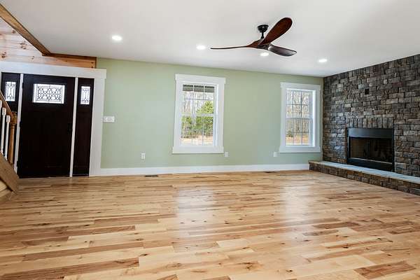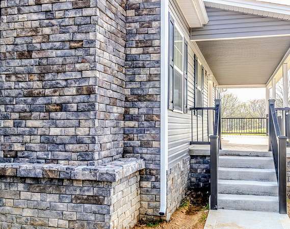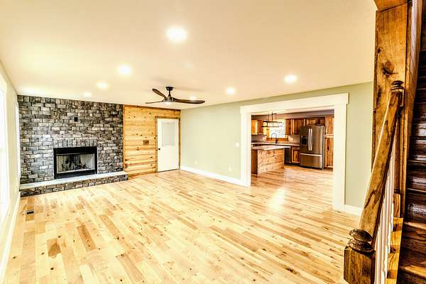 The exterior captivates with its durable vinyl siding, artfully accented by natural stone trim and a striking stacked stone chimney, ensuring curb appeal and understated elegance.