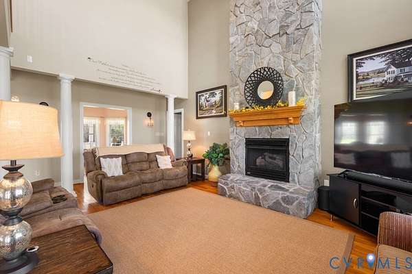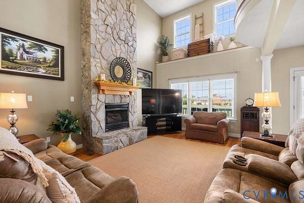 The 3,600 sq ft residence features covered front and rear porches bridging the great outdoors with the refined interior. The 1st level boasts 9-foot ceilings, beautiful hardwood floors, and a dramatic two-story family room with a floor-to-ceiling stone fireplace. The kitchen is outfitted with cherry cabinetry and updated appliances. For main-level living, the primary suite is a true sanctuary, featuring two walk-in closets and a luxury bath equipped with a jetted tub, separate shower, and double vanity.