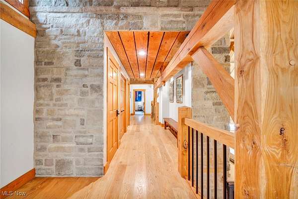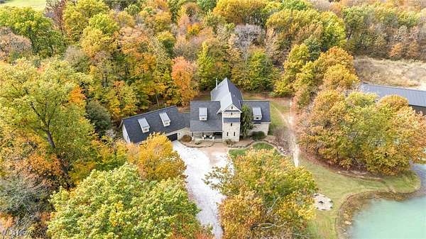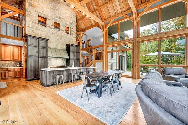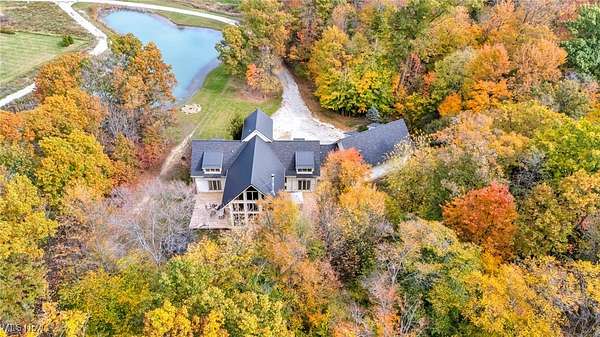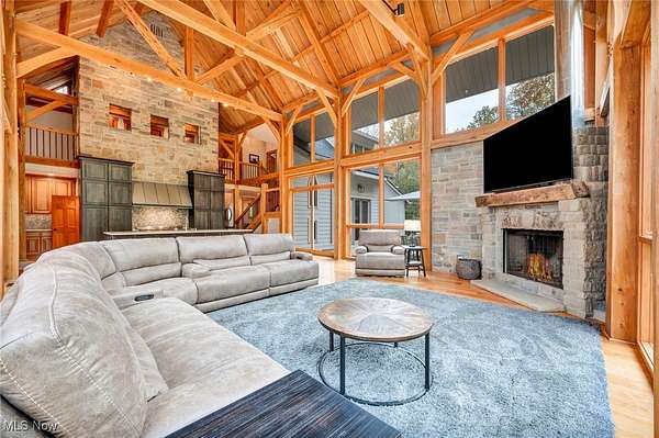 Prepare to be impressed by this stone and timber-frame construction retreat set on 10 scenic acres. This home features 5 spacious bedrooms, 3 full baths, 1 half bath, 4 car attached garage, 40 x 100 pole barn, stocked pond and more! Step inside the stunning great room and kitchen, featuring 38-foot stone walls and timber-frame construction that create a truly dramatic yet warm ambiance. The main staircase continues the timber-frame craftsmanship. The gourmet kitchen is a chef's dream with custom cabinetry, quarts counter tops, top of the line American range with 6 cast iron burners and a 24" griddle, full hood, and a full walk-in pantry with floor to ceiling shelving. The first-floor luxurious owner's suite offers a spa-like retreat with a heated ceramic floor, whirlpool bath, custom shower and beautiful finishes. All full bathrooms are spacious, have custom showers and whirlpool baths. The upstairs bedrooms feature high, open ceilings, adding to the home's airy design. The full basement offers endless possibilities. Recent updates include: Kitchen Cabinets and Quartz Countertops, American Range/Oven, Roof, HVAC upgrades, 40 x 100 Pole Barn, 2 20 x 25 Decks, Safe, Upgraded Banisters and more! Schedule your private showing today!
