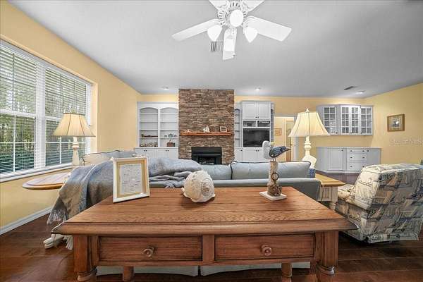 The spacious living room serves as a stunning focal point, featuring a beautiful stone gas fireplace, built-in entertainment center, and French doors leading to the expansive back porch, allowing natural light to fill the space and providing peaceful views of the surrounding property.