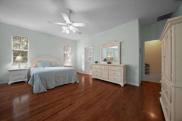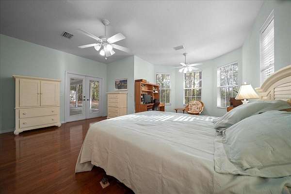 The primary suite offers a private retreat, complete with a large sitting area, walk-in closet, and French doors that open directly onto the back porch.