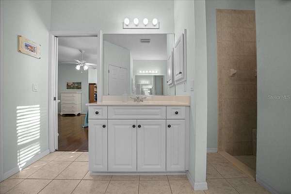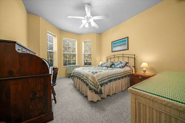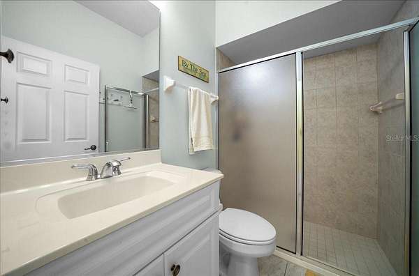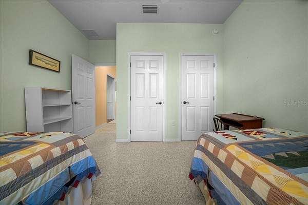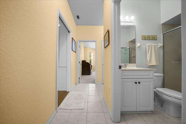 On the opposite side of the home, two additional bedrooms provide privacy for family or guests and share a well-appointed bathroom with a glass-enclosed shower.