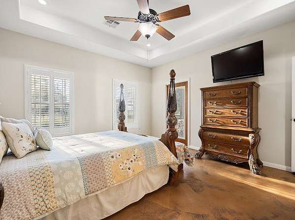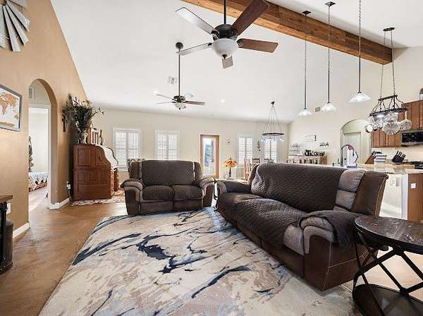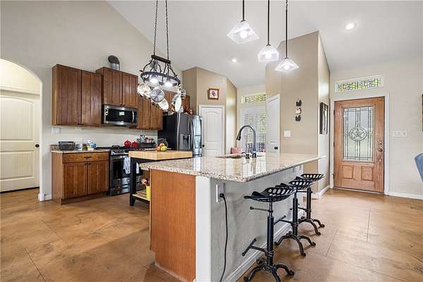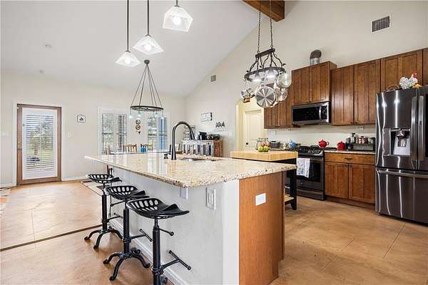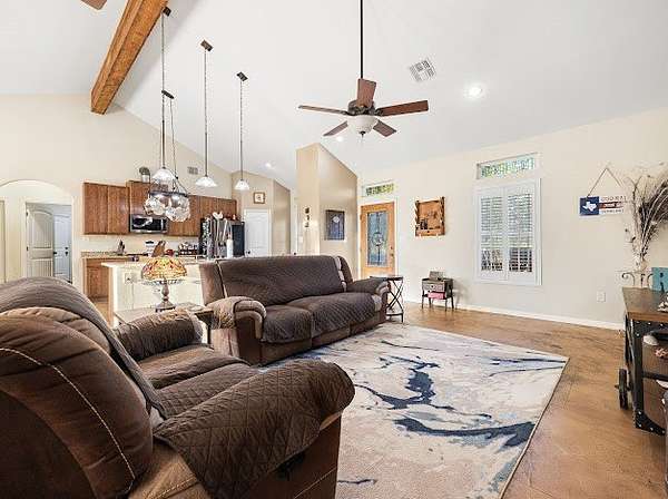 Experience country living with modern touches in this beautiful Sinton home, perfectly situated on 4.58 acres with room to grow. Step inside to an inviting open floor plan where rustic charm meets thoughtful design. The kitchen is a chef's dream featuring rich maple cabinets, granite countertops, two pantries, a spacious island with storage and seating, and a gas range-perfect for gatherings and everyday living. The living space is highlighted by stained concrete floors and a striking ceiling beam that spans the entire room, adding to the rustic motif. A split-bedroom layout offers privacy, with two bedrooms on each side of the home. Both the primary suite and guest suite feature private baths, while the primary boasts a spa-like shower with dual shower heads, a built-in seat, double vanities, and dual walk-in closets. Additional features include a large utility room with abundant storage and thoughtful details like a cozy window seat with storage. Outdoors, you'll find plenty of space for animals, hobbies, or future expansion-all within a peaceful, private setting. Generator with 10 year warranty included in the sale. Schedule your private showing today and see everything this property has to offer!