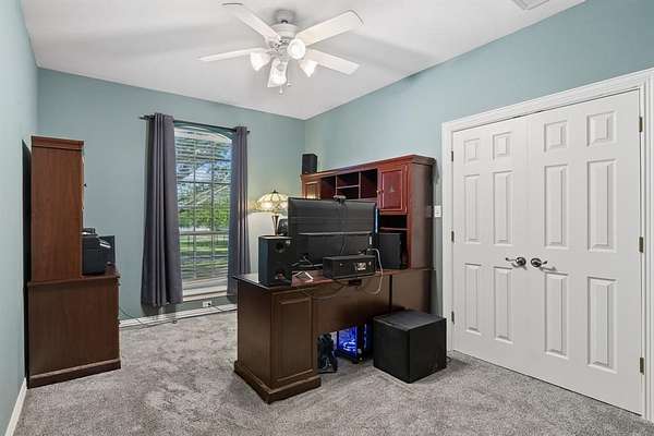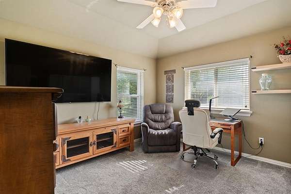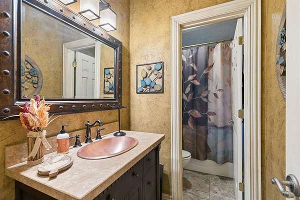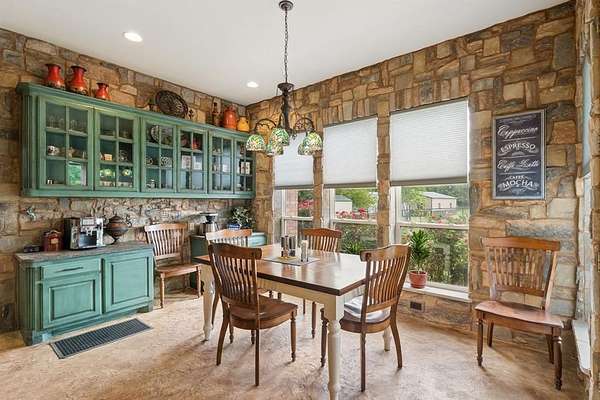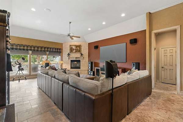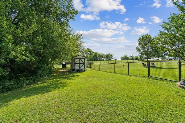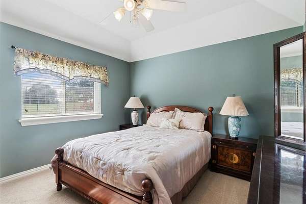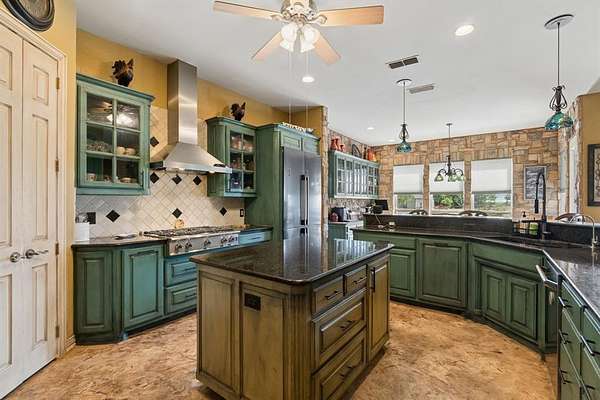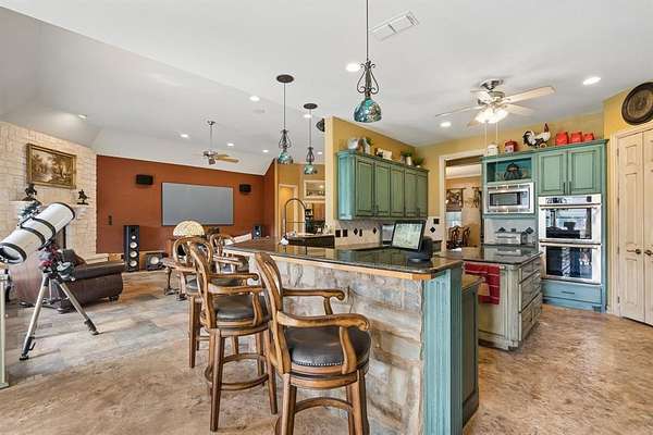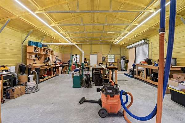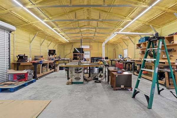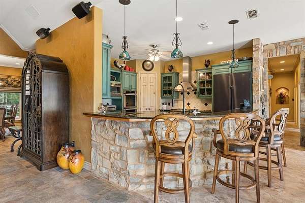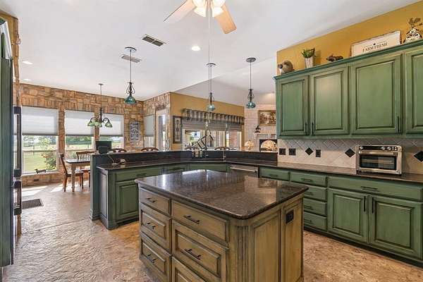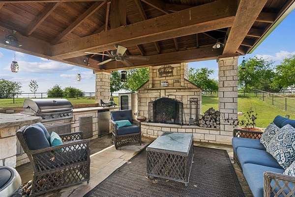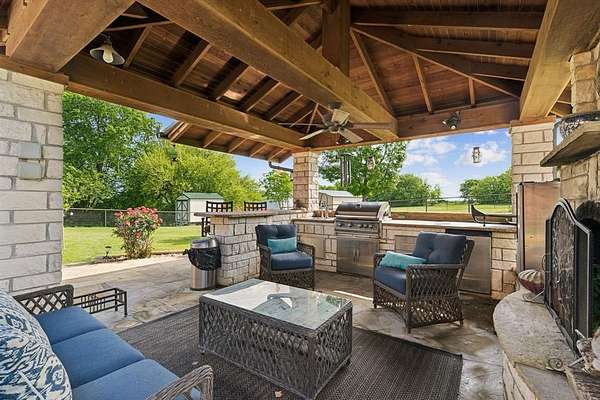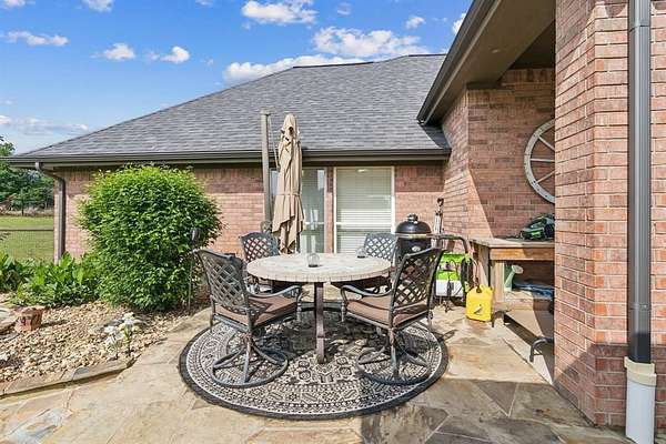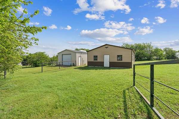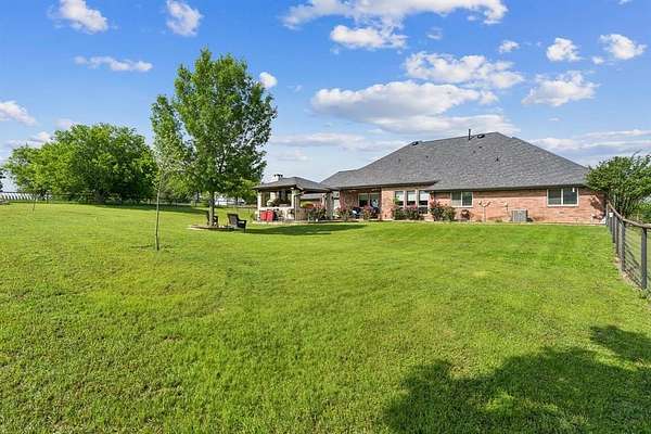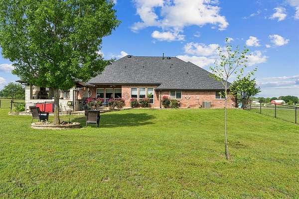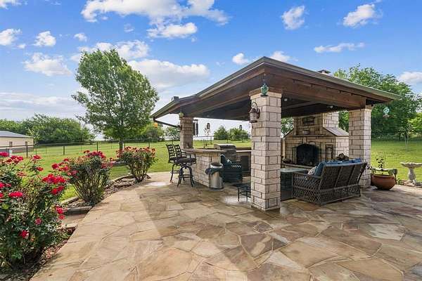 Nestled on over 3 beautifully treed acres in Rhome, this stunning brick home offers the perfect blend of privacy, functionality, and upscale finishes. A welcoming circle driveway sets the tone as you arrive, leading to a thoughtfully designed 4-bedroom, 3-bath layout with all bedrooms conveniently located on the main level and a spacious game room upstairs. Step inside to find stained concrete flooring throughout the main living areas, kitchen, and hallways, creating a seamless and low-maintenance living space. The open-concept living room features a striking stone fireplace and ceiling fan, flowing effortlessly into the well-appointed kitchen. Designed for both everyday living and entertaining, the kitchen boasts a built-in Dacor refrigerator, New Hestan commercial-grade gas range, large island, stone breakfast bar, walk-in pantry, and a charming breakfast area complete with glass-front cabinetry and a Tiffany-style light fixture. A dedicated office at the front of the home includes French doors, built-in desk, and cabinetry—ideal for working from home. The spacious primary suite offers a relaxing sitting area and a luxurious ensuite bath with separate vanities, garden tub, and an oversized walk-in closet with built-ins. Secondary bedrooms are thoughtfully split for added privacy. All bathrooms feature distinctive copper sinks, adding a custom touch throughout. Outdoors, enjoy a true entertainer’s retreat with a covered living area featuring a built-in grill, stone fireplace, refrigerator, and breakfast bar. The property also includes two separate workshops, providing ample space for hobbies, storage, or business use. This unique property combines peaceful country living with high-end amenities—don’t miss the opportunity to make it yours!