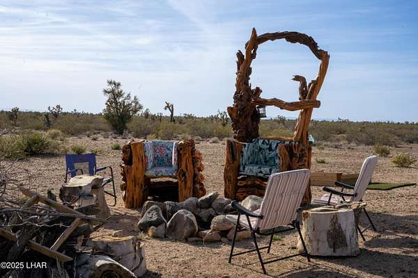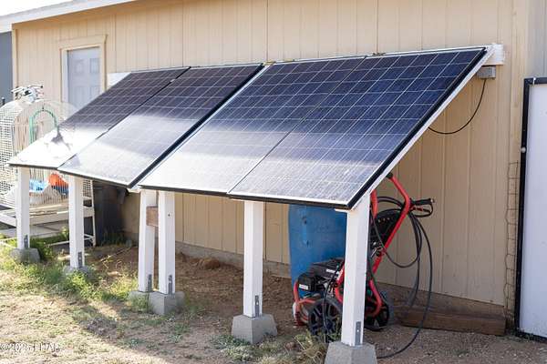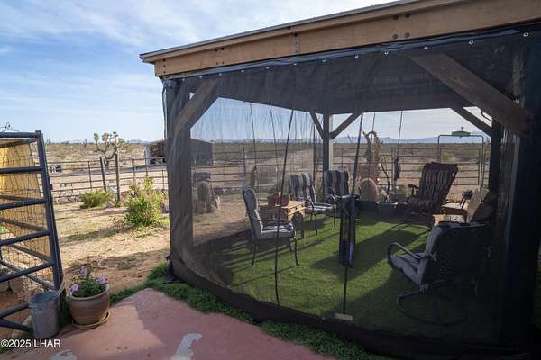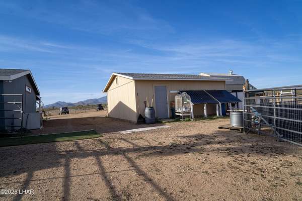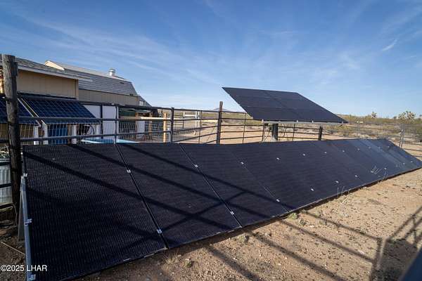 Secluded 40-Acre ranch, PRIVATE WELL and NEW SOLAR SYSTEM make this a perfect homestead. Situated next to over 3,000 miles of government land for privacy and off road adventure. Well maintained 3-Bedroom home boasts nearly 1,800 Sq. Ft. Spacious open floor plan, vaulted ceilings, cozy fireplace, washer, dryer, refrigerator, and stove. This turn-key property has everything you need for a desert getaway or full time home. Features a high yield 8-GPM private well, 2,500 gallon storage tank inside a 16x12 pump house/shed, propane tank, NEW solar system with lithium batteries, a detached garage PLUS a large metal carport for all your toys. Enjoy the amazing views from the covered patios or the screened gazebo. Grow your own food in the green house or fenced yard with fruit trees. Steel rollup security shutters on all windows to protect your investment. Gorgeous mountain view, Access County maintained Alamo Rd. Association maintained interior roads. Lush with Juniper, Joshua Trees, Ocotillo, and Barrel Cactus. Come visit and make Stagecoach Trails at Santa Fe Ranch your home. Well Registry # 55-207343.