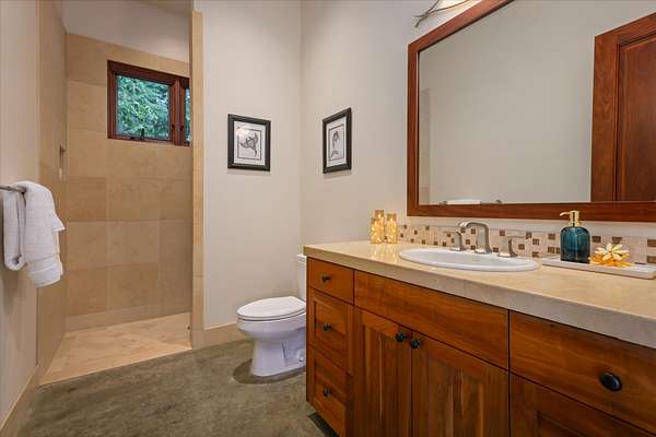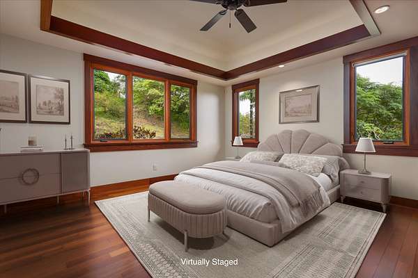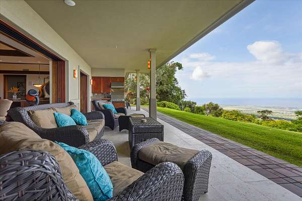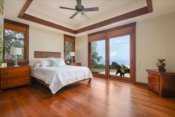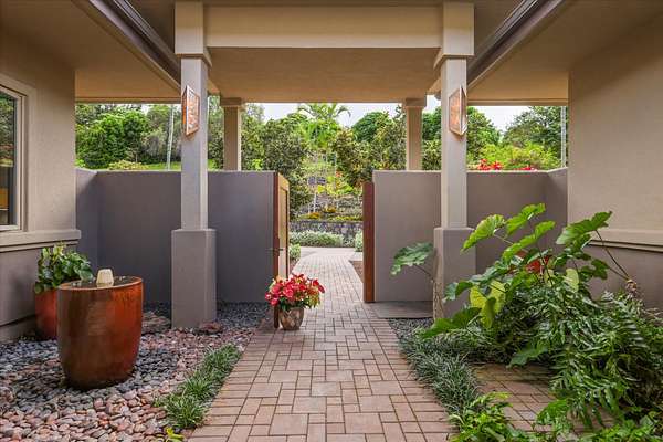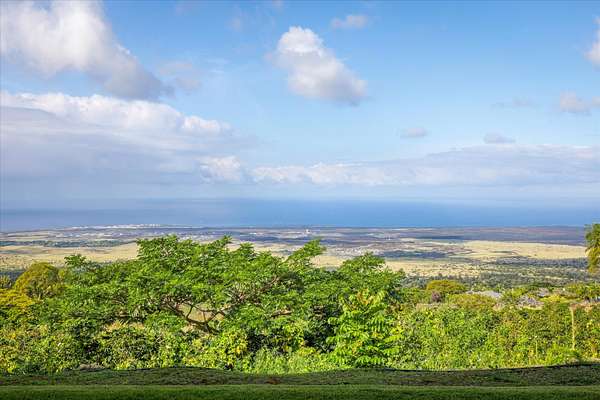 Spectacular West-Facing Ocean View Estate on 3+ Private Acres - Gated, Multifunctional Property with Detached Guest Cottage, Coffee Orchard & Ag Tax Potential. - Expansive Pacific Ocean Views ~ capturing dramatic year round sunsets, lovely morning sunlight and the perfect balance of sunshine and rain at this 1,380' elevation. - Main residence built with exceptional quality materials featuring stunning travertine tile flooring from the front entry through the great room to the 660+ Sq Ft rear lanai, central air conditioning, and beautiful hardwood floors in the bedrooms, with Afromosia (African Teak) wood trim throughout, a sophisticated & comfortable island home estate. - From the moment you enter the courtyard and are greeted by the gentle sounds of the bubbling fountain, you will appreciate how the home was designed for indoor-outdoor living, with a beautiful balance of luxury, complemented by earth based materials, and room for a pool and other expansion possibilities. - The private outdoor shower off the primary suite with generous private lanai has ample space for chaise lounges, a hot tub, and massage table creating your own home spa. - Detached 1-bedroom guest cottage with full bath, and kitchenette is completely separate from the main home and is perfect for visitors, caretaker housing, and extended family. Adjacent to the guest cottage is a huge 2nd garage, ideal for an artist studio, gym/exercise room, or workshop. -The main house also features its own oversized 2-car attached garage, with additional attic storage space above. - Coffee-producing acreage below the home with an established cultivator ready to assist the new owners, offers agricultural possibilities w/ the potential for property tax advantages - A Pre-inspection was done with the majority of items addressed, sold partially furnished. - This timeless home gives one an opportunity to feel the connection to nature while enjoying a pampered life~