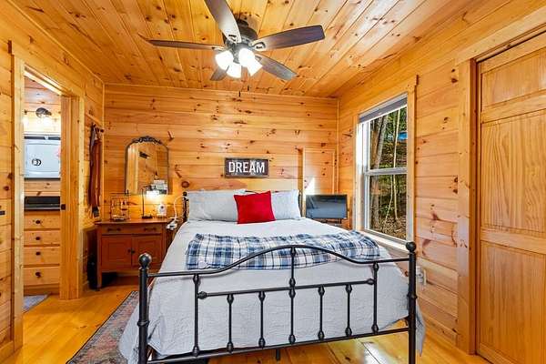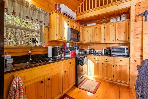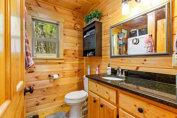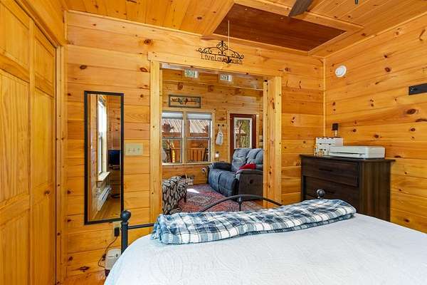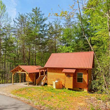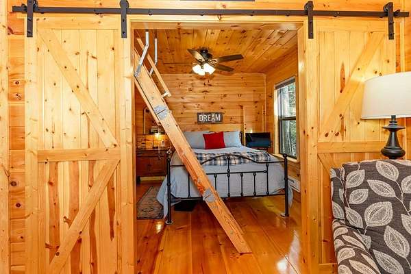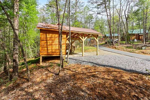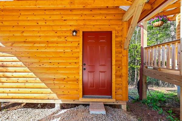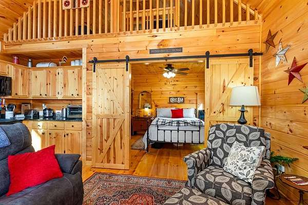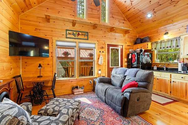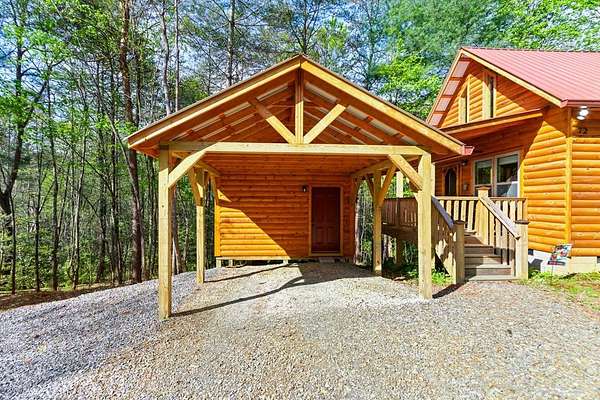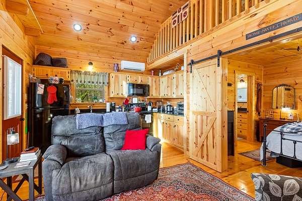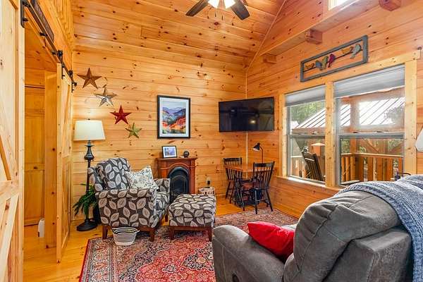 Tucked away on over an acre in the peaceful Whispering Hills neighborhood, this 1 bedroom, 1 bathroom log-sided cabin blends rustic character with modern comfort. With easy paved road access all the way to the property, you'll enjoy both convenience and tranquility from the moment you arrive. Parking is just steps from your front door, making everyday living effortless. Step onto the inviting front porch and enter through a custom rustic screen door that sets the tone for the warm, cozy interior. Inside, the Great Room welcomes you with rich wood floors, wood walls, and a vaulted tongue-and-groove ceiling that creates an open, airy feel while maintaining that classic cabin charm. A gas-log fireplace adds the perfect touch of warmth and ambiance. The kitchen offers lots of cabinet and granite counter space, complemented by matching black appliances for a cohesive look. Just beyond, the bedroom is tucked behind a stylish double barn door, offering both privacy and character. The en suite bathroom features a granite countertop and convenient laundry connections with washer and dryer included. In the bedroom, pull-down steps lead to a versatile loft space—ideal for storage, a reading nook, or a creative retreat. Let your imagination bring this bonus area to life. Outside, a detached single carport includes an additional flexible room perfect for a workshop, hobby space, or extra storage. Additional highlights include a tankless water heater and Fiber Optic internet, ensuring efficiency and connectivity.