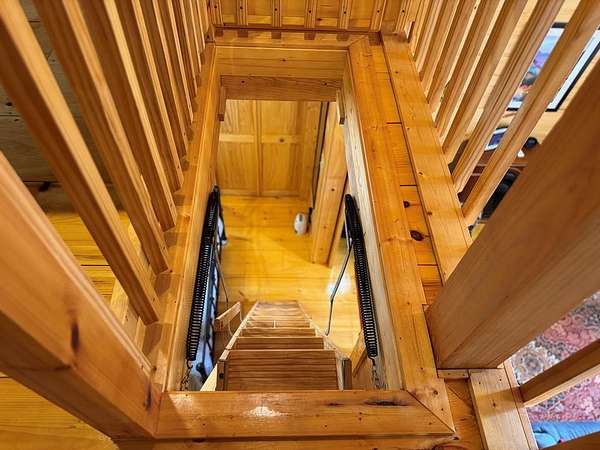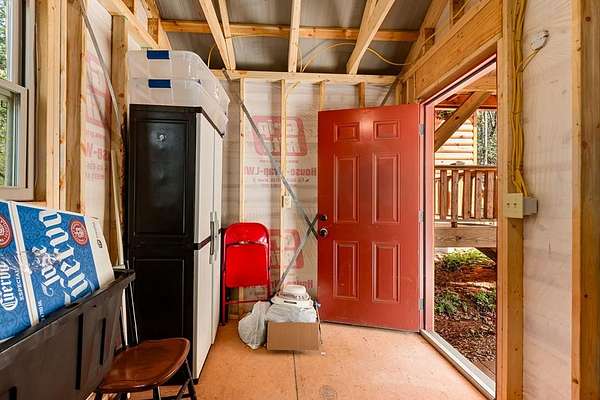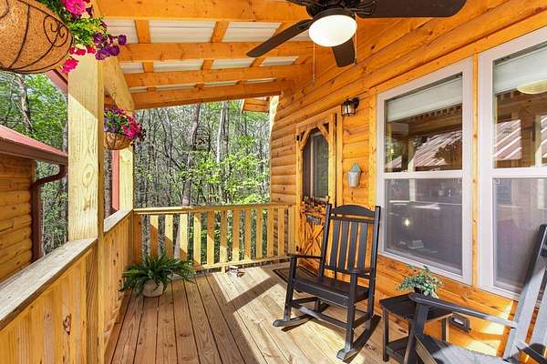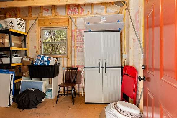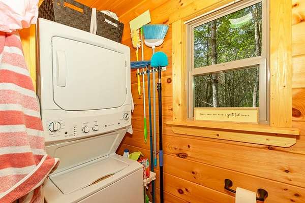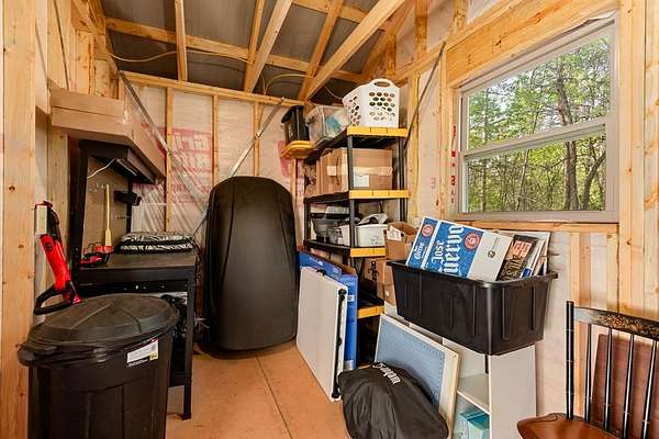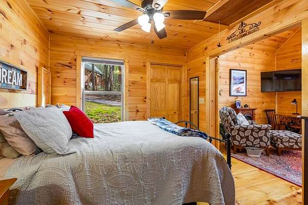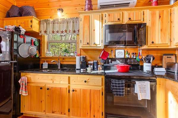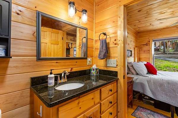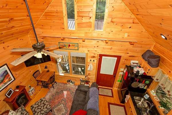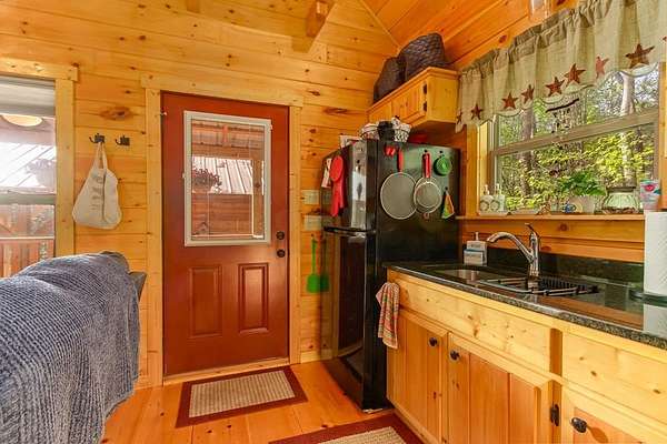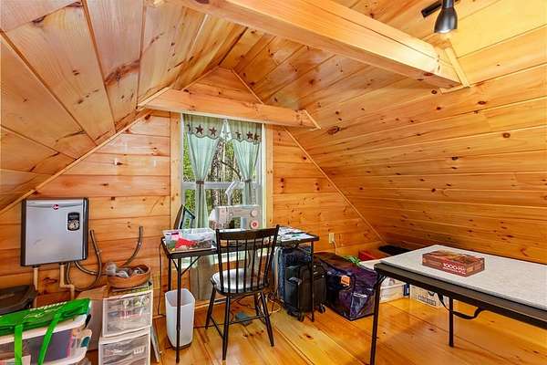 Tucked away on over an acre in the peaceful Whispering Hills neighborhood, this 1 bedroom, 1 bathroom log-sided cabin blends rustic character with modern comfort. With easy paved road access all the way to the property, you'll enjoy both convenience and tranquility from the moment you arrive. Parking is just steps from your front door, making everyday living effortless. Step onto the inviting front porch and enter through a custom rustic screen door that sets the tone for the warm, cozy interior. Inside, the Great Room welcomes you with rich wood floors, wood walls, and a vaulted tongue-and-groove ceiling that creates an open, airy feel while maintaining that classic cabin charm. A gas-log fireplace adds the perfect touch of warmth and ambiance. The kitchen offers lots of cabinet and granite counter space, complemented by matching black appliances for a cohesive look. Just beyond, the bedroom is tucked behind a stylish double barn door, offering both privacy and character. The en suite bathroom features a granite countertop and convenient laundry connections with washer and dryer included. In the bedroom, pull-down steps lead to a versatile loft space—ideal for storage, a reading nook, or a creative retreat. Let your imagination bring this bonus area to life. Outside, a detached single carport includes an additional flexible room perfect for a workshop, hobby space, or extra storage. Additional highlights include a tankless water heater and Fiber Optic internet, ensuring efficiency and connectivity.