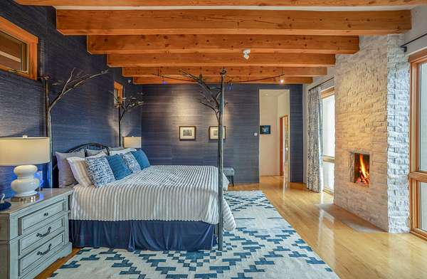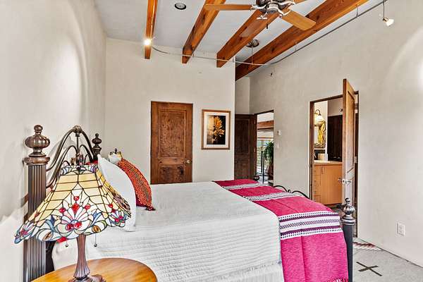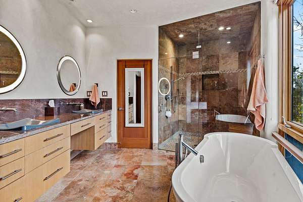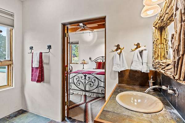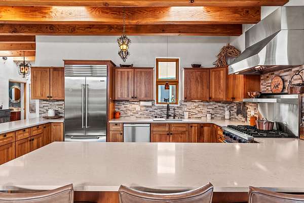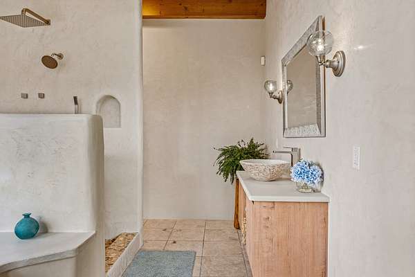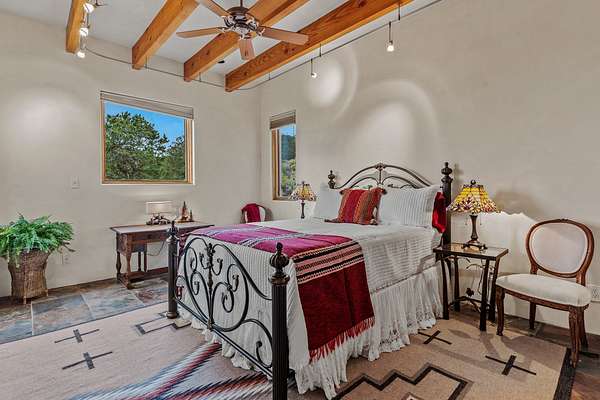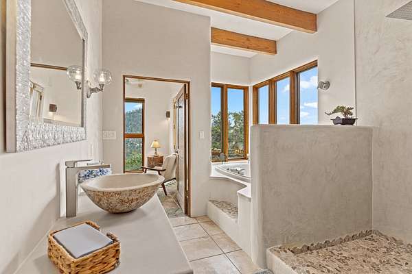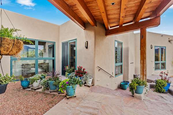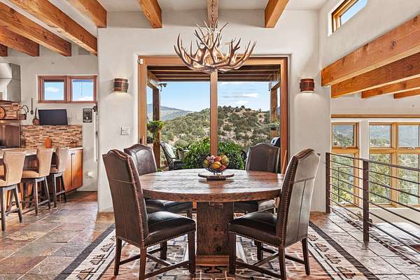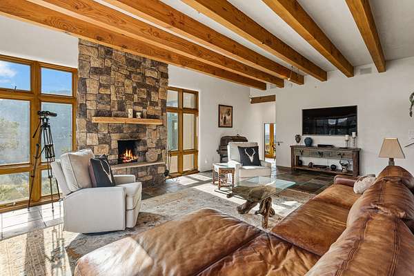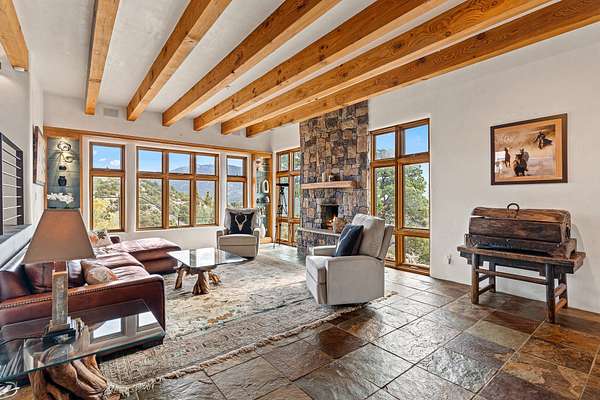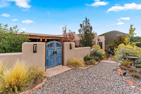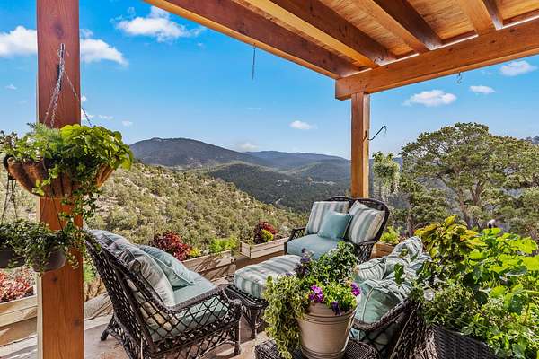 Perched over La Barbaria Canyon this mountain top, contemporary pueblo-styled, light filled 4-bedroom, 2-full and 2- ( 3/4) bath home dazzles with floor-to-ceiling windows, multiple skylights, stunning mountain views, and a mountainside viewing arena with a firepit and unobstructed views into La Barbaria Canyon and the Pecos Wilderness. Featuring 2 primary suites at opposite ends of the home, the open floor plan flows from the grand foyer into the luxurious Chef's kitchen to the dining area, 2 ensuite bedrooms and the sunken living room with stone fireplace. The kitchen features custom cherrywood cabinetry, wrap around counter with bar seating, Sub-Zero, Viking and Miele appliances and a wine cooler. Enjoy radiant heat throughout and 10' ceilings with gorgeous wooden beams in every room. All rooms feature stellar mountain views. One master suite, added in a renovation completed by Sharron Woods, includes a fireplace and a spacious, wheelchair accessible master bathroom with a free-standing tub and an oversized steam shower. The second master suite features a large tub with big mountain views, a large, open shower, and its own deck. Outdoor living is enhanced by a gated driveway with large parking area, a walled courtyard, portals and mountainside patios. Enjoy the moonrise from the east side hot tub. Additional features include an oversized 2-car garage and Culligan purified water system. This is luxurious Santa Fe living in an irreplicable mountaintop dreamscape.