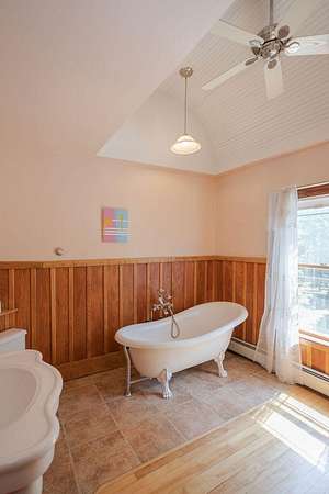 Step back in time and experience the charm of this beautifully preserved Victorian home, offering 2,800 square feet of living space filled with character and timeless elegance. Set on a meticulously landscaped 2.34-acre mini-estate, this property is a rare find with a perfect blend of period details and modern comforts. The main level features a spacious kitchen with granite countertops, a pantry, and a classic cast iron woodstove, along with a half bath for convenience. Entertain in the formal dining room, relax in the parlor, and enjoy gatherings in the living room, all adorned with original woodwork, trim, and vintage velour wallpaper. A first-floor bedroom adds flexibility for guests or one-level living. Upstairs, you'll find four bedrooms with gleaming wood floors and two full bathrooms. The third floor offers a large, light-filled unfinished space with endless possibilities for additional living area, studio, or home office. The detached barn features two finished office spaces on the lower level. Above, a 2-bedroom, 1-bath apartment could be an income-producing rental. The barn froze 2024, plumbing, heating and boiler needs replacement. Two garages provide ample storageaEUR"one for the main house and another on the adjoining lot, which includes its own septic system and drilled well. Enjoy the outdoors with 238 feet of frontage on Spear Stream, six heritage apple trees, oriental pear trees, blueberries, blackberries, and perennial gardens. Relax on the large front porch with its grand colonnade beams, unwind in the gazebo or on the side porch, and find tranquility in your own sauna retreat. A workshop/potting shed and a whole-house propane generator complete this impressive package. All buildings are uniformly painted in a period-appropriate palette, ensuring the estate's cohesive and authentic aesthetic. Properties like this don't come around oftenaEUR"schedule your private showing today and experience the grandness of this Victorian estate firsthand!