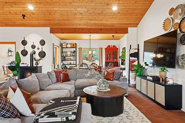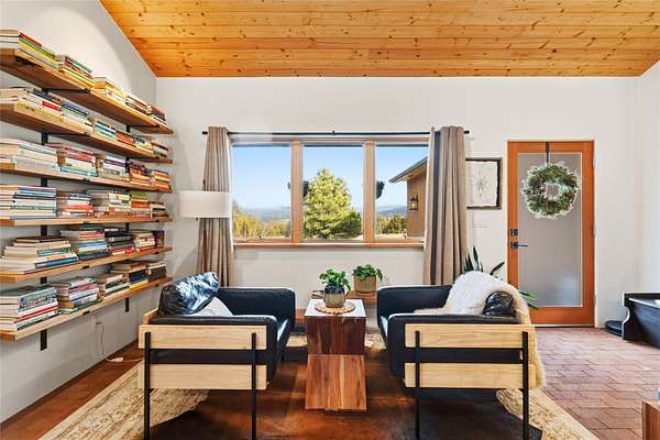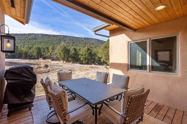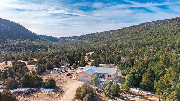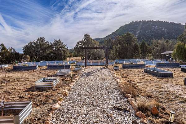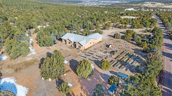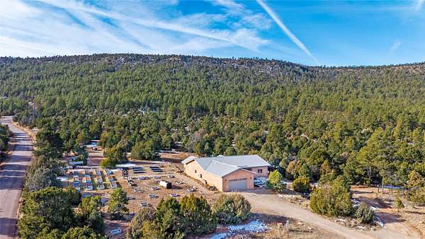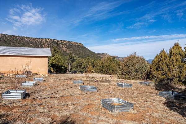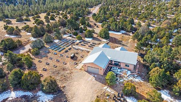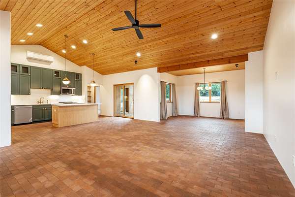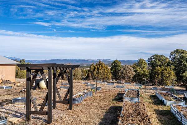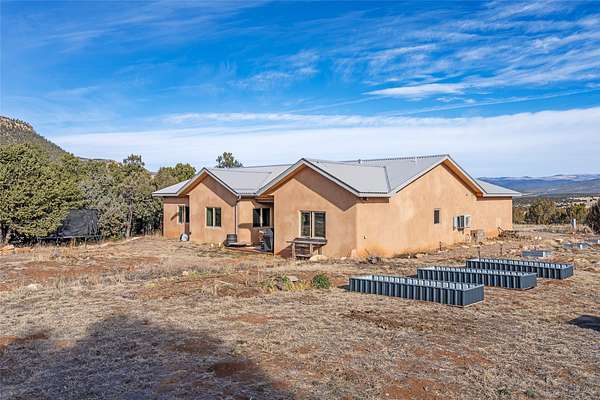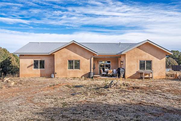 Freshly prepared for spring, this well-maintained property has been thoughtfully refreshed and is move-in ready. Recent updates include fresh interior paint, a newly installed septic system (March 2026) with a two-year warranty, deep-cleaned carpets, cleared personal property, and spruced raised garden beds. The sellers have recently moved out and are presenting a timely opportunity for the next owner. Located at the base of Rowe Mesa, this ranch-style home sits on approximately 3.7 acres of mostly level, usable land, offering expansive skies, mountain views, and a sense of rural privacy-all within an approximate 30-minute drive to Santa Fe. Built in 2021, the custom home features a modern ranch aesthetic with a pitched propanel roof, stucco exterior, and natural finishes throughout. The open-concept living and kitchen area includes island seating, a pantry, and access to the attached two-car garage. Interior details include brick flooring, wood cabinetry, subway tile accents, and wood-planked ceilings. The home offers three bedrooms and two bathrooms, providing flexible living options. Radiant in-floor heating and mini-split systems support year-round comfort. Exterior features include mature fruit trees and established raised garden beds. The property borders public lands associated with the Santa Fe National Forest, offering nearby access to outdoor recreation. This property presents a rare combination of newer construction, usable acreage, and a beautiful high-desert setting.