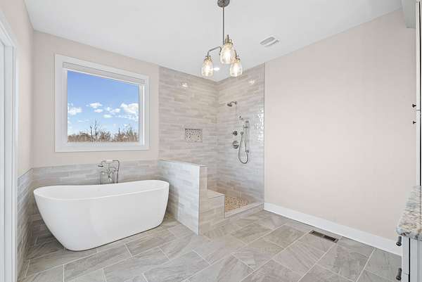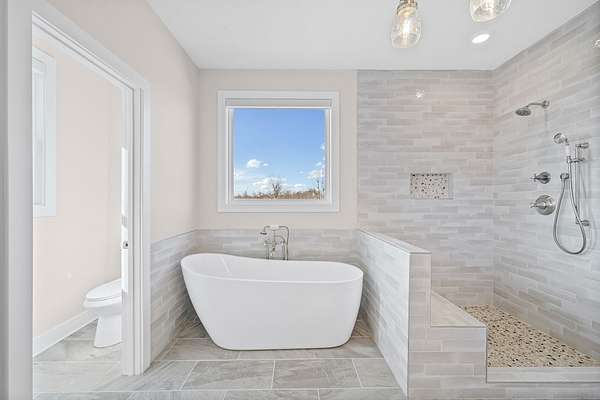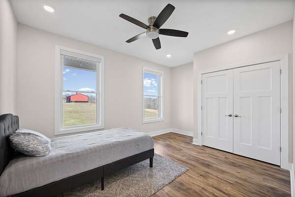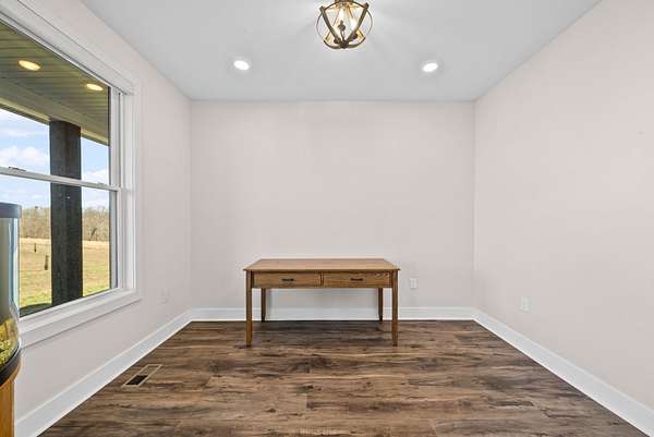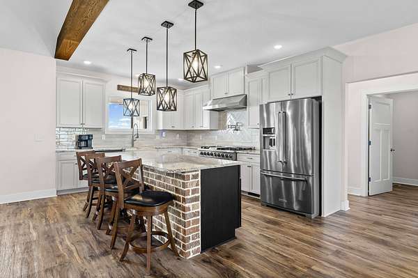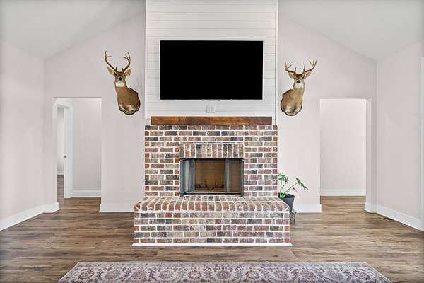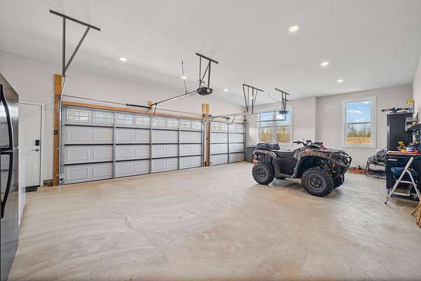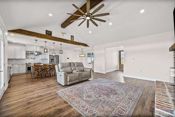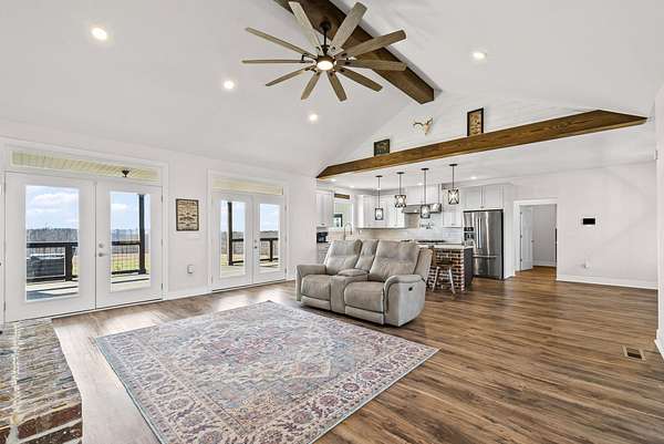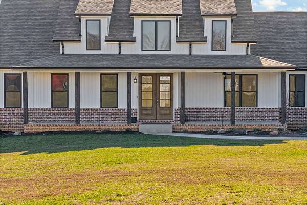 Welcome to your private estate on 47 Acres! Custom built in 2024; this sprawling 2,799 SqFt ranch home is beautifully surrounded by acres of hardwoods and is set back from the road for ultimate privacy. French doors welcome you into the vaulted entryway. A flex room, perfect for a home office or formal dining room, is conveniently located off the entryway. Luxury vinyl floors flow from the front door into the spacious living area where wood beams and a brick fireplace accent the space beautifully. Two sets of French doors allow the best view of your acreage, oversized back porch, back patio and backyard. The chef's kitchen is adorned with a Thor double oven gas range with griddle, pot filler, large farmhouse sink and an extra-large island with storage and a built-in microwave. A large open dining area and walk-in pantry with custom door complete the open-concept space. The primary suite features a wood beam to compliment the vaulted ceiling, French doors to the back patio, two large walk-in closets, and luxury vinyl flooring while the primary bathroom boasts separate vanities, extra storage cabinetry, tiled shower and a free-standing tub with surround tile. Bedroom two features its own full bathroom, perfect for guests, while bedrooms three and four share a joined full bathroom. The main level is completed by a half bath, a tiled laundry space with sink and extra storage cabinetry and a three-car garage. Outside you will find a giant covered deck with propane line installed for a grill, and a large patio. The home features a tankless hot water system, full home filtration system and downstairs, a full unfinished walkout basement (2,799 SqFt) with plumbing for future bathroom. The property has an abundance of deer and wildlife and is in greenbelt to help save on property taxes. The large 30x50 (1,500 SqFt) shop/barn has all the space you will ever need for equipment storage. Home recently appraised for $1,425,000.00.