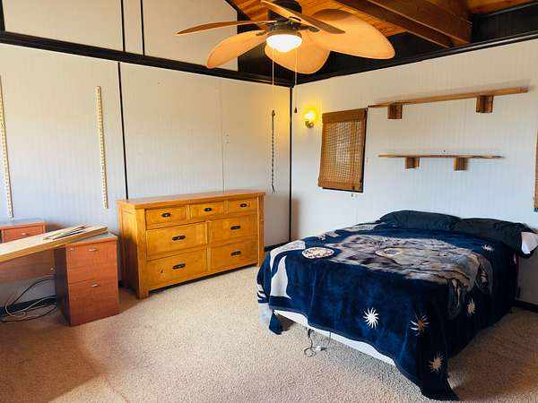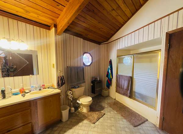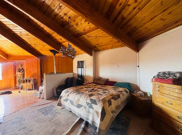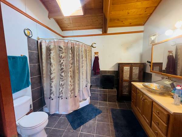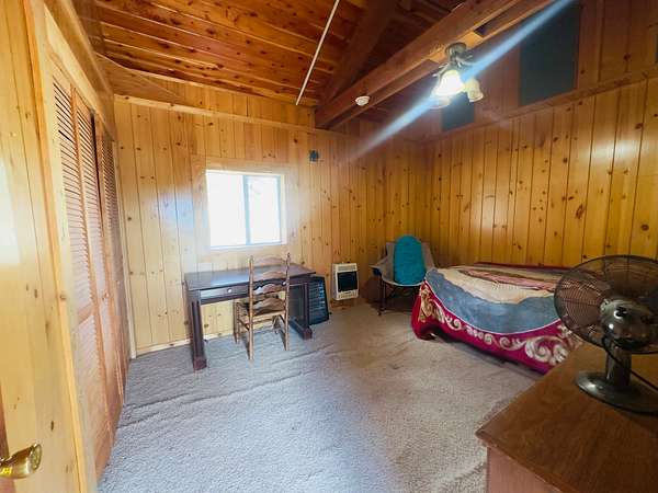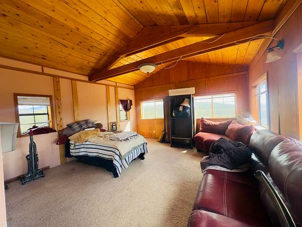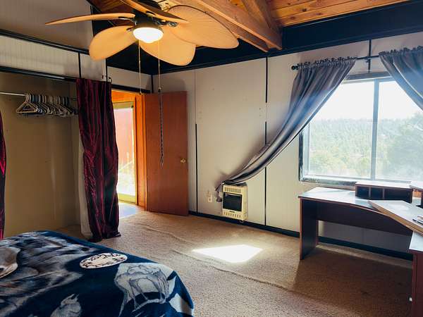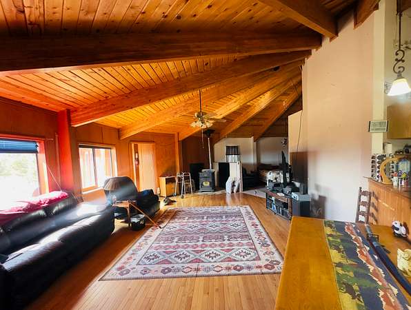 This 3-bedroom, 2-bathroom mountain home offers 2,310 square feet of living space plus an 884 square foot attached garage, giving a handy buyer plenty of room to work with. The home is a true fixer-upper and needs a new roof along with other updates, but the bones and character are there for someone ready to roll up their sleeves. Inside, the design is surprisingly distinctive, featuring circular ceiling beams that create a warm, lodge-like feel and a semi-open floor plan that flows comfortably between spaces. The kitchen includes oak cabinetry and tile flooring, while both bathrooms are also finished with tile. The living and dining areas feature narrow-plank wood flooring and the bedrooms are carpeted. Heating is provided by propane heaters in the bedrooms and a pellet stove in the main living area.