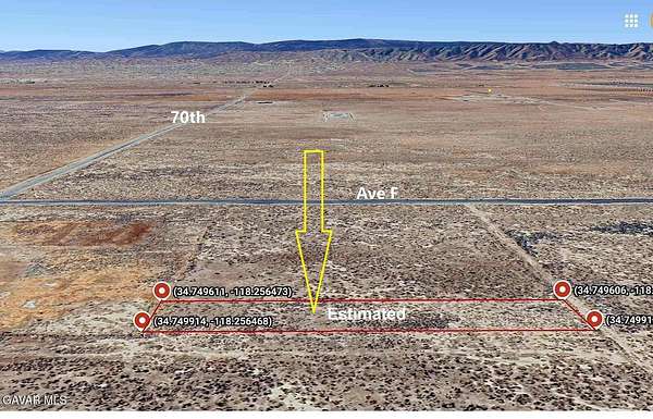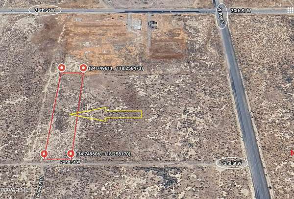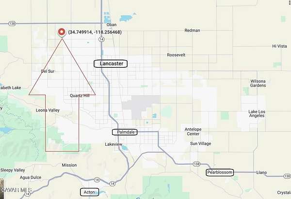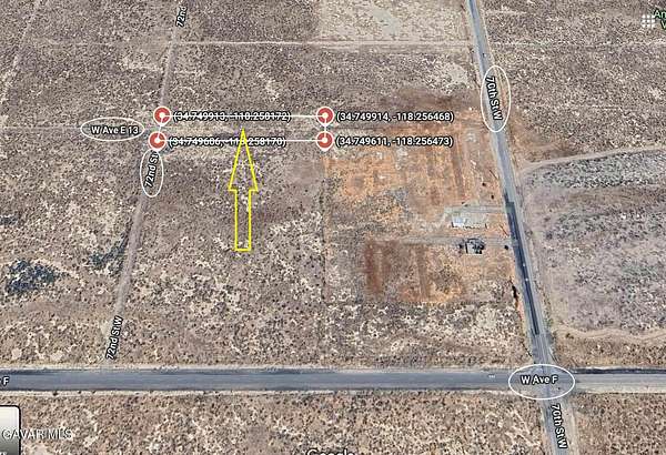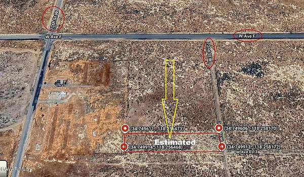 Est $177/moOwner will carry any credit OK. Nice 1.27 acre parcel on the west side of Lancaster, 72nd and E-13 Access clearly marked, See plot map. Just about 1k feet North of Ave F (paved & Power) Address is jus an approximate Text or mail for more pictures Don't miss this fantastic opportunity to own a piece of tranquility near Antelope Acres in west Lancaster