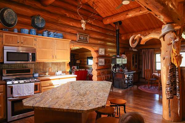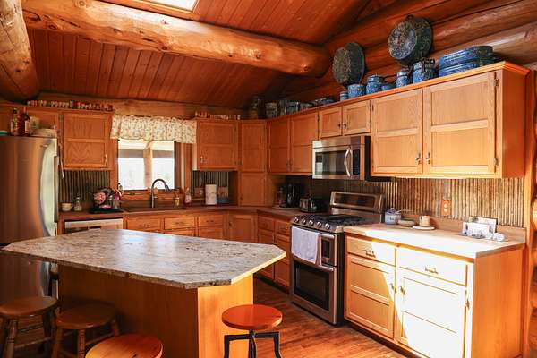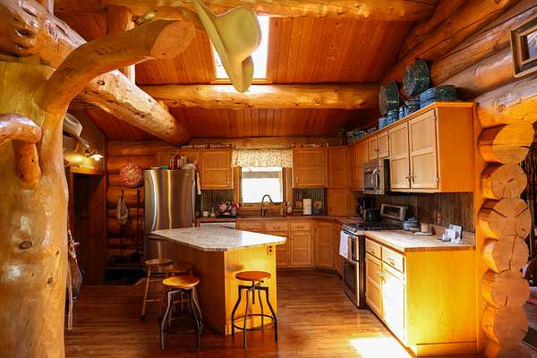 With having Landowner Preference this permit has very high odds of drawing year after year. Last year odds were 100% draw for both resident and non-resident for archery. The rifle permit was 70% for residents and 100% for non-residents.Acreage Breakdown10,253 Deeded Acres2560 BLM Lease Acres640 State Lease AcresImprovementsThe Windancer is well equipped with 3 different housing options. The home favored by the owners is a beautiful Log Home built in 1977 and later remodeled in 1998. The owners selected a perfect location to build this 2,288 square foot log home. A lightly timbered driveway leads to the entrance of the home, where exceptional craftmanship is evident immediately. While entering the house through the wrap-around deck you are greeted with impressive vaulted ceilings in the main living area as well as a cozy fireplace to hunker up around after cold morning hunts on the ranch. Continuing past the living area you'll find the kitchen, accentuated with high-end amenities including tiled floors, granite countertops, and stainless-steel appliances. An oversized two car garage is attached to the house by way of a large mud room that includes a half bath, perfect for cleaning up when coming in from outside. An additional pole barn for dry storage of equipment, vehicles and ATV's is easily accessible near the log home entrance as well.The Windancer also has two smaller homes on the property.