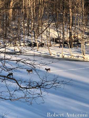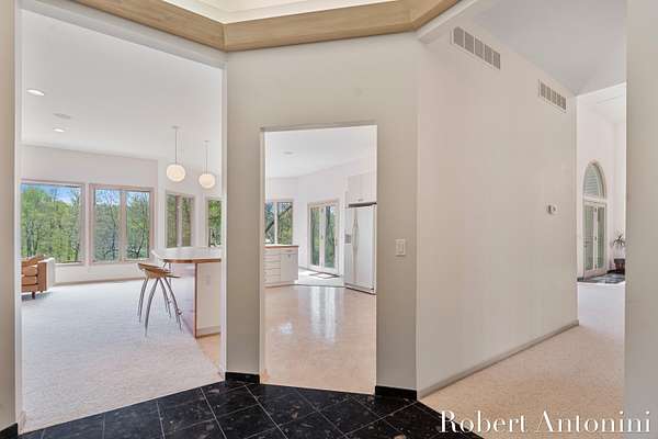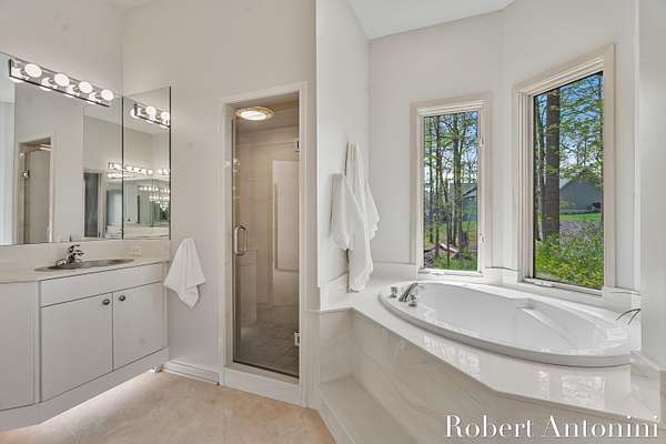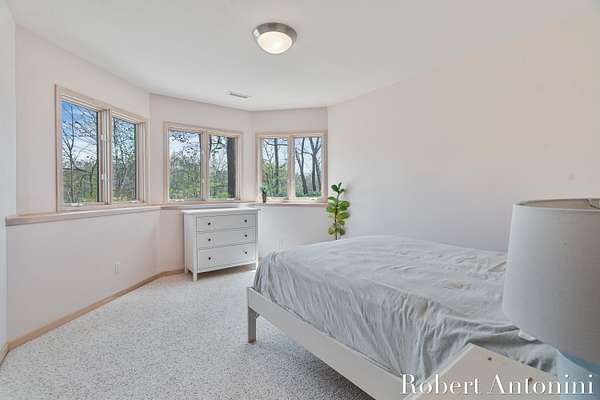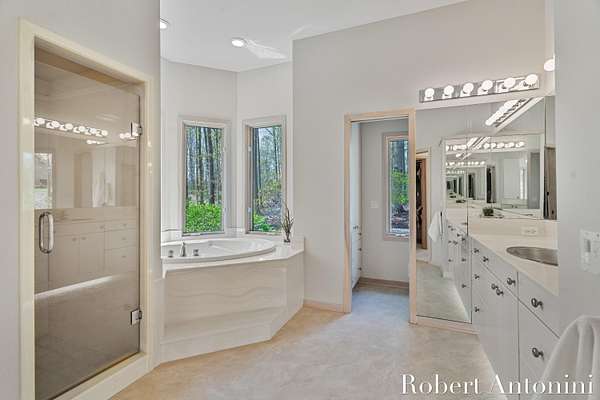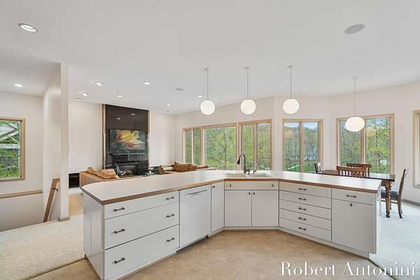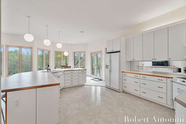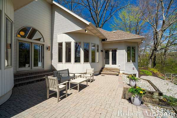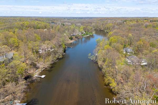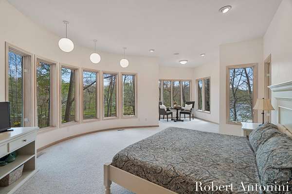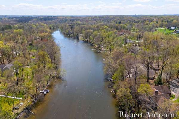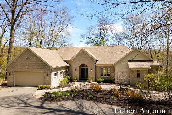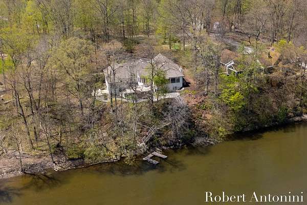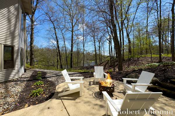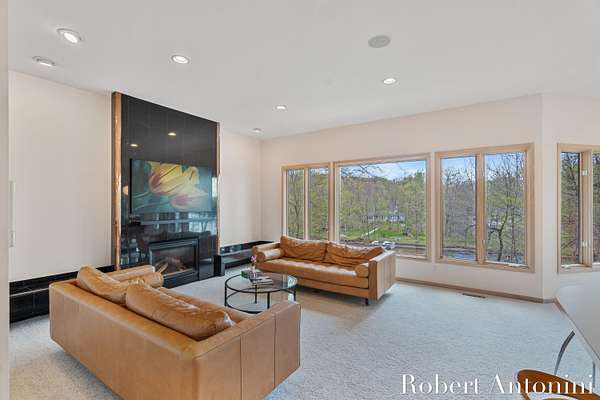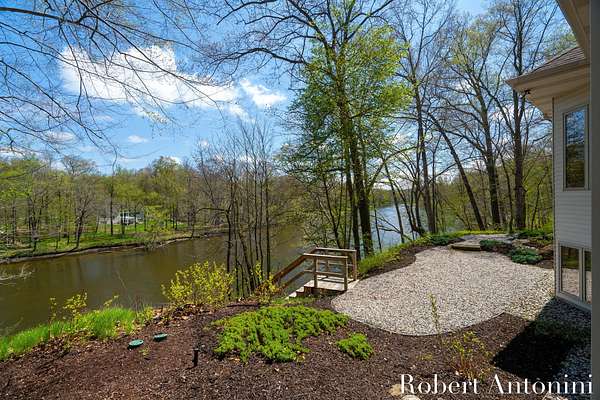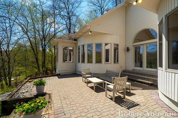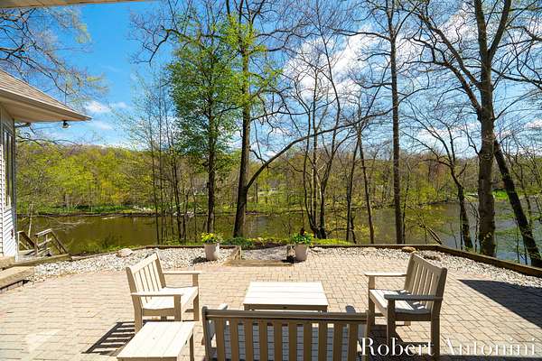 Spanning over 4,000 square feet, this elegant residence is situated at the end of a secluded driveway on a newly repaved private road. The main floor boasts an open-concept layout, including a gourmet kitchen, a spacious great room with a fireplace, and panoramic windows that highlight the tranquil, wooded landscape and riverfront. The primary suite provides a private retreat, complete with a hearth room, and a spa-like bathroom featuring dual vanities, a soaking tub, and in-suite laundry. The walkout lower level includes a full second kitchen, a recreation room with a fireplace, two additional bedrooms, and a full bathroom, ideal for guests.