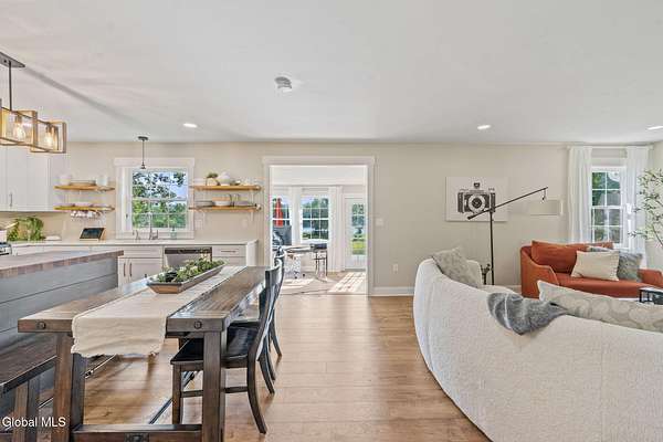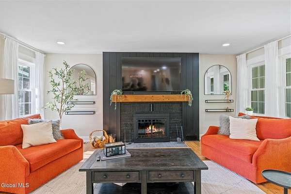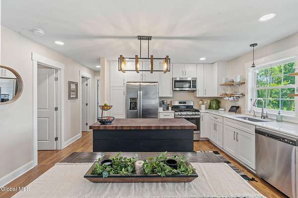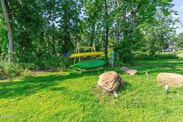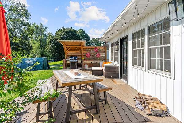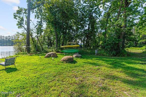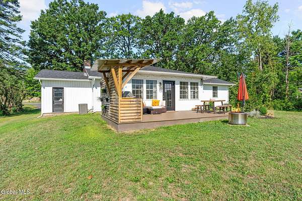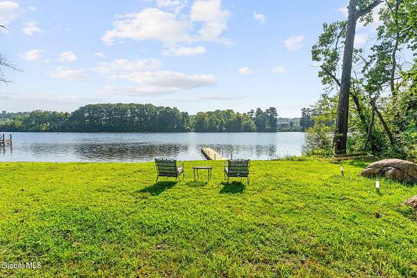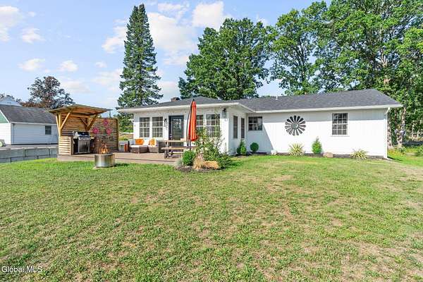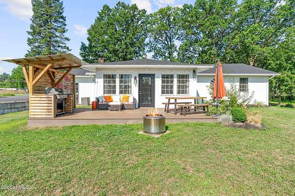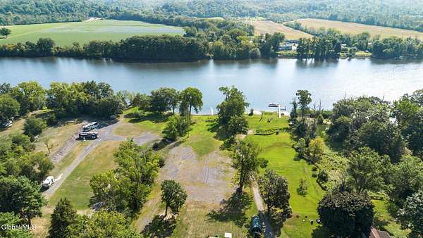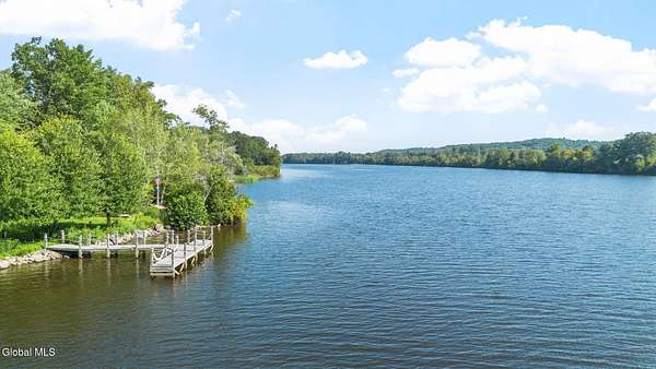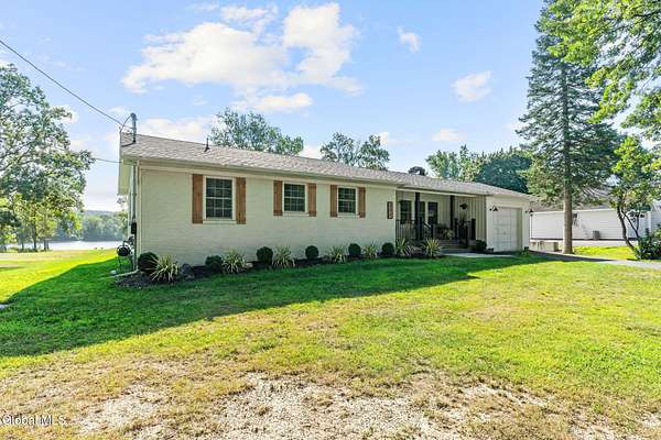 Fully renovated Hudson riverfront retreat offers serene 100 ft of direct river frontage, new 40 ft dock, Trex front porch & back deck w/grilling station - perfect for entertaining! This stylish single level ranch features an open layout, new kitchen w/butcher block island, quartz counters, SS appl and custom finishes throughout. Dining & living areas flow seamlessly showcasing a custom accent wall w/FP. Luxury vinyl plank flooring throughout. Primary suite with walk-in tiled shower, walk-in closet, along with 2 additional BRs that can be utilized for office/flex space. Upgrades include new roof, siding, Pella windows/doors, HVAC, 200-amp electrical. Additional vacant lot provides a total of 1.59 acres offering space, privacy or future potential. Low taxes! Close to Albany & Saratoga.