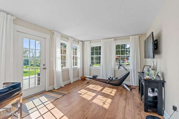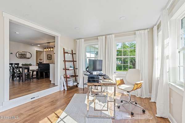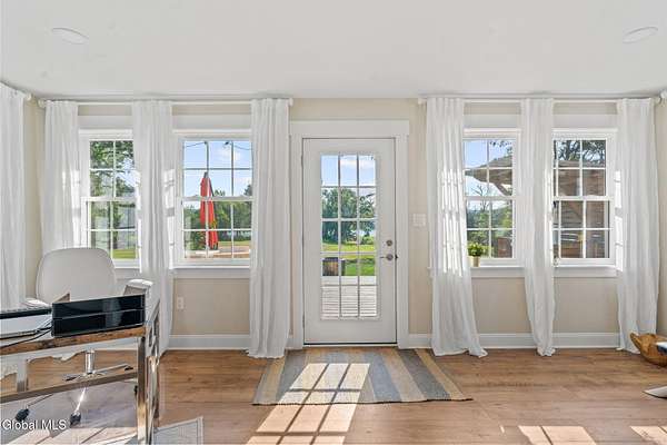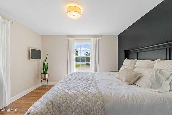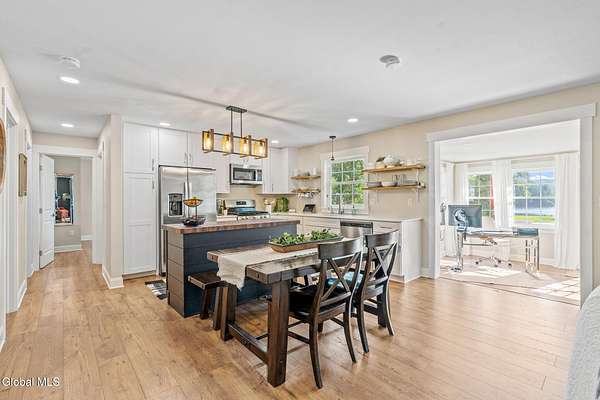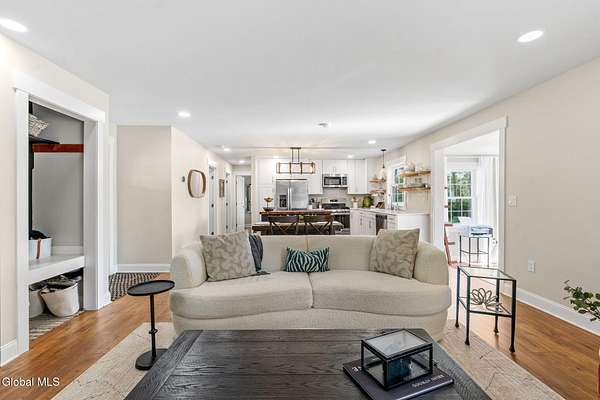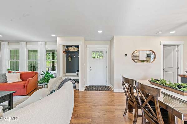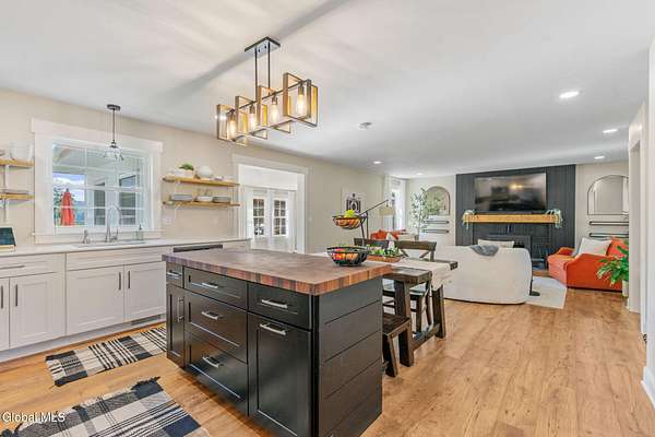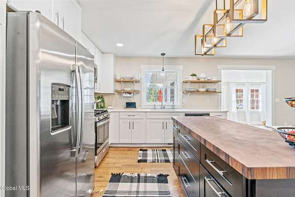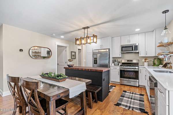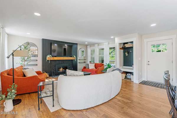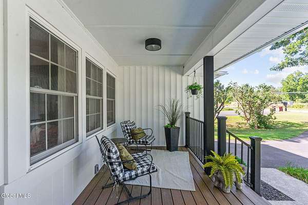 Fully renovated Hudson riverfront retreat offers serene 100 ft of direct river frontage, new 40 ft dock, Trex front porch & back deck w/grilling station - perfect for entertaining! This stylish single level ranch features an open layout, new kitchen w/butcher block island, quartz counters, SS appl and custom finishes throughout. Dining & living areas flow seamlessly showcasing a custom accent wall w/FP. Luxury vinyl plank flooring throughout. Primary suite with walk-in tiled shower, walk-in closet, along with 2 additional BRs that can be utilized for office/flex space. Upgrades include new roof, siding, Pella windows/doors, HVAC, 200-amp electrical. Additional vacant lot provides a total of 1.59 acres offering space, privacy or future potential. Low taxes! Close to Albany & Saratoga.