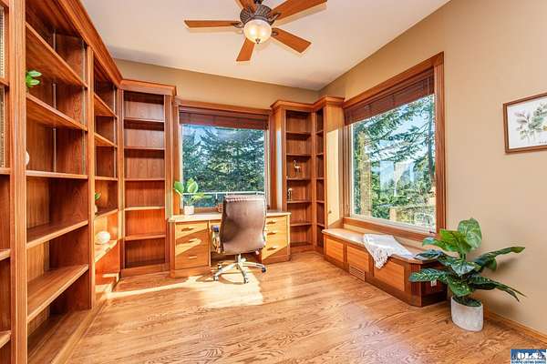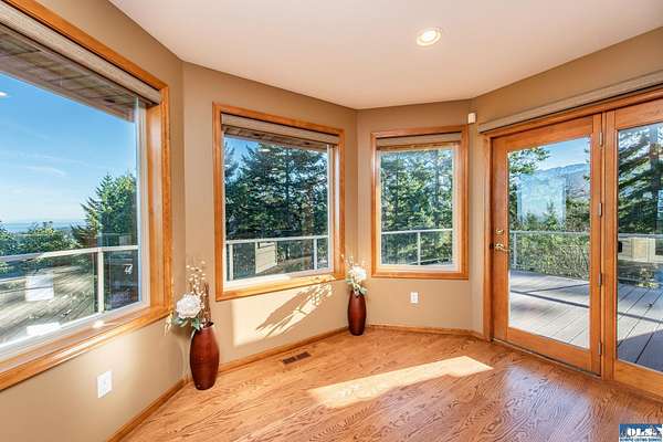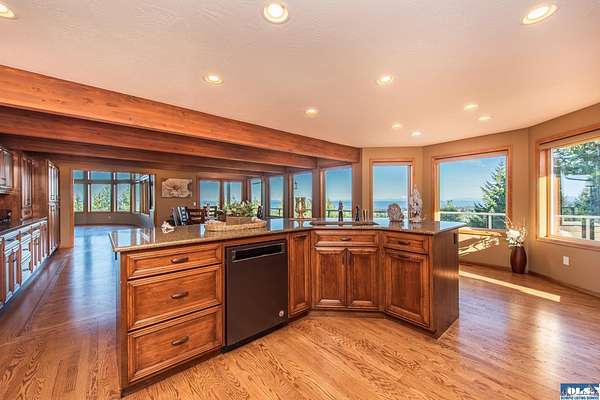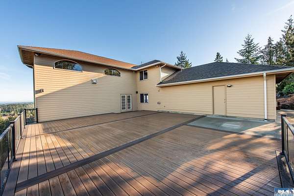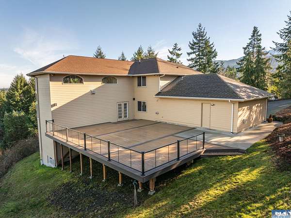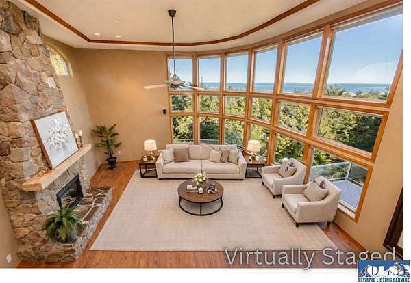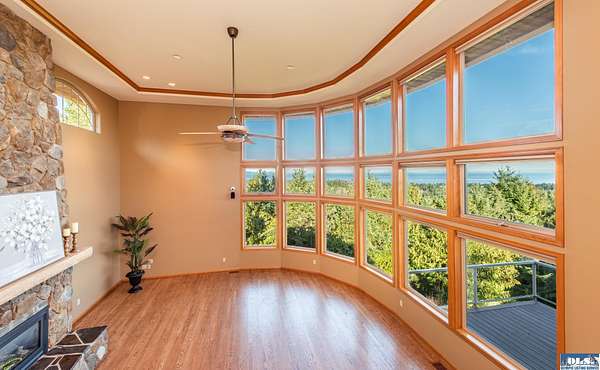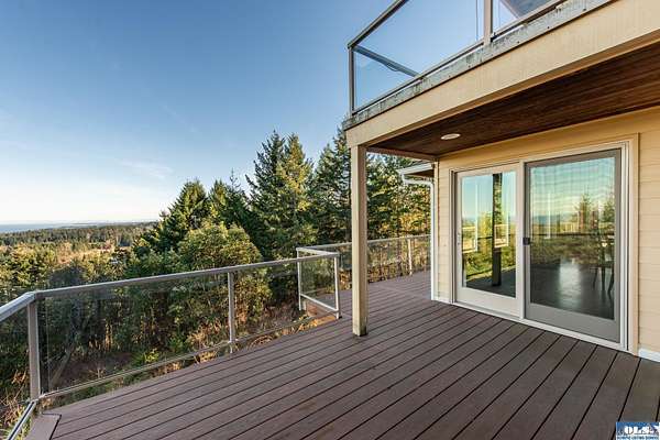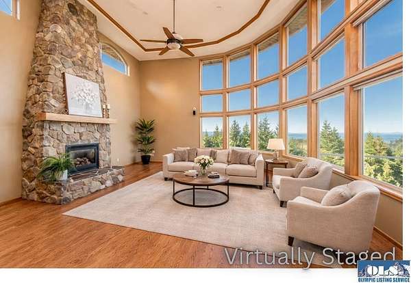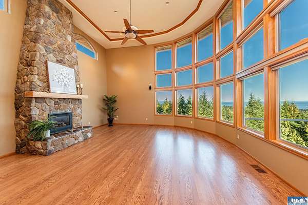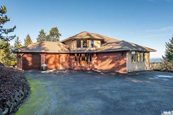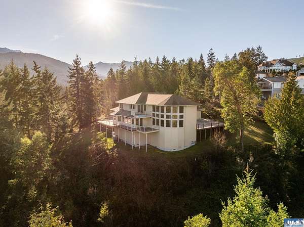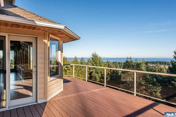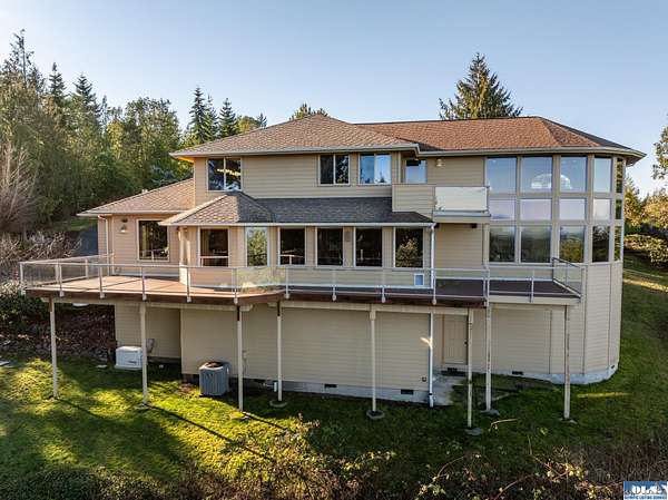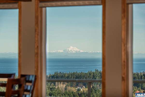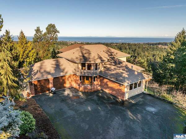 Perched at the pinnacle of Sunset Heights Drive, this exceptional two-story residence commands one of the most coveted vantage points on the North Olympic Peninsula — where the shimmering waters of the Strait of Juan de Fuca, the majestic silhouette of Mt. Baker, the harbor glow of Port Angeles, and the rugged faces of Black Diamond and Klahanne Ridge unfold before you in every direction. This is not simply a home. It is a daily encounter with the extraordinary. From the moment you arrive, the home's scale and craftsmanship signal something exceptional. A finished, insulated, and heated two-car garage — 624 square feet, level with the main floor — provides seamless, everyday convenience without compromising the home's polished aesthetic. The entry hall sets a tone of refined elegance that carries throughout every room. Designed for grand living the heart of the home is its breathtaking great room, where soaring 25-foot ceilings draw the eye upward and a commanding stone fireplace anchors the space with warmth and drama. Rich hardwood floors flow underfoot, catching the light from generous windows that frame the panoramic views beyond. The seamless connection between the living room and family room creates a fluid living experience ideal for both intimate evenings and large-scale entertaining. The gourmet kitchen is a culinary statement — thoughtfully appointed with premium appliances including a propane range, dishwasher, built-in microwave, and refrigerator, all complemented by a walk-in pantry of exceptional proportion. An adjacent dining room offers a refined setting for formal meals, while the kitchen's eating space invites casual morning gatherings with those same spectacular views as a backdrop. A private home office on the main floor speaks to the property's rare blend of luxury and practicality quiet, well-positioned, and beautifully appointed. A half bath, utility room, and entry hall complete the main level with purposeful elegance. Over 2,460 square feet of composite deck through the great room onto a sweeping composite deck — one of two totaling over 2,460 square feet — and experience the full magnitude of this property's setting. Whether hosting a sunset gathering or simply savoring morning coffee as the harbor lights fade into daybreak, the outdoor spaces of this home are as livable as any interior room. Year-round sunrises and frequent wildlife sightings. A private primary suite sanctuary accessed through elegant French doors, the primary suite is a world unto itself. A private balcony extends the living space outdoors, offering unobstructed views of the Strait and surrounding peaks. The luxurious ensuite bath features a jetted soaking tub, separate shower, heated marble floors, and a generous walk-in closet — a combination of materials and appointments that rival the finest boutique hotels. Below the main floor, 1,000 square feet of pristine unfinished space awaits your vision — whether a custom home gym, wine cellar, artist's studio, additional bedrooms, or a professional workshop, the potential is limited only by imagination. Thoughtfully equipped this home has been outfitted with the infrastructure to match its stature: a whole-home generator, comprehensive security system, built-in central vacuum, ceiling fans, and a propane stove and fireplace ensure year-round comfort and peace of mind. Wired for a generator and featuring a water heater and dual-zone heating capability, the home performs as beautifully as it presents. Situated on 5.05 private acres just west of Port Angeles via Highway 101, the property offers the rare combination of seclusion and accessibility minutes from downtown amenities, Olympic National Park, and the Strait of Juan de Fuca. waterfront.