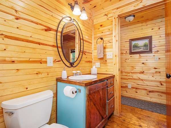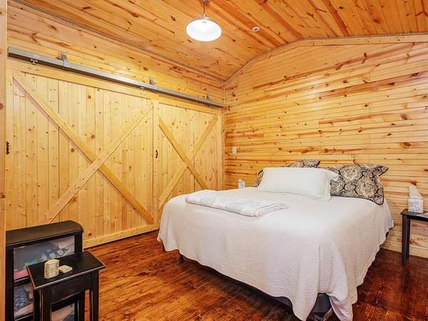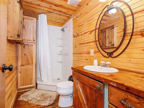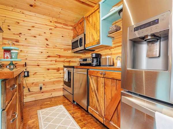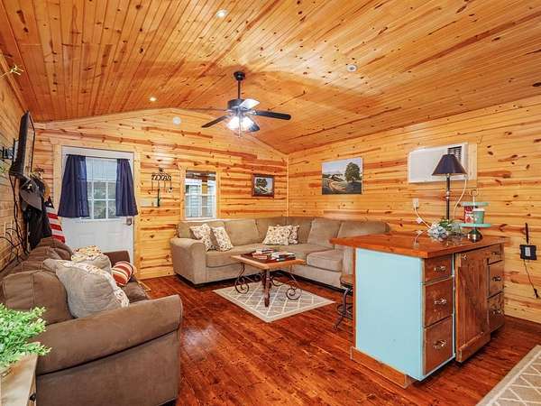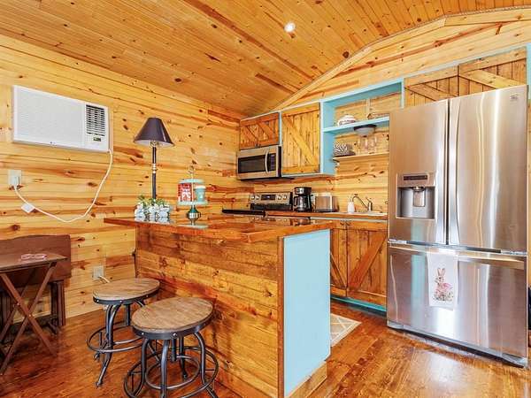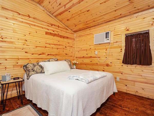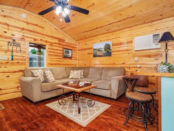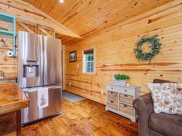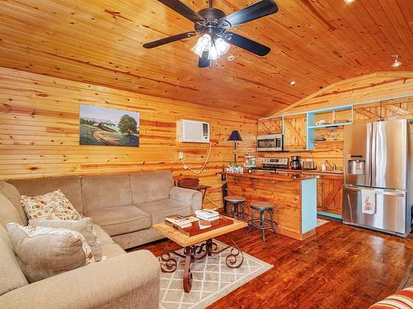 A welcoming white gate and circle drive lead you to a charming living area, 1-bedroom, 1-bath cabin. Inside, you’ll find an eat-in kitchen equipped with a stove, built-in microwave, dishwasher, and refrigerator, along with roomy bedroom designed for comfortable living including a washer & dryer. All the furnishings convey except for a few personal items.