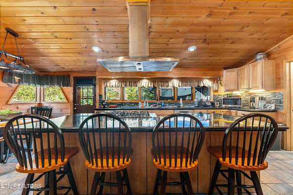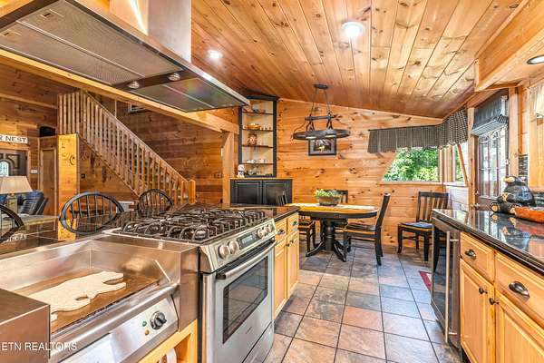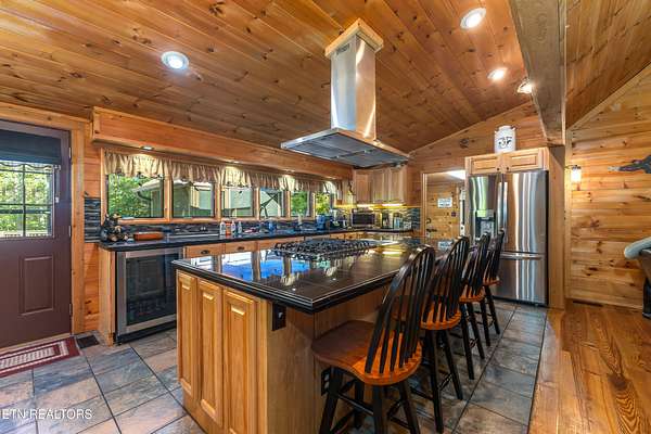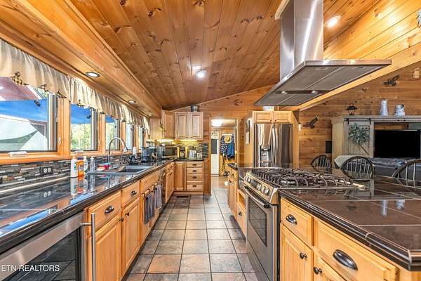 Inside, you'll find a welcoming great room featuring a stone fireplace, wood ceilings and walls, and surround sound for your entertainment needs. The updated and well-equipped kitchen showcases a large island, stainless appliances, built-in wine cooler, and a coffee station set against stylish black ceramic tile and glass backsplash. Additional highlights include a spacious laundry room with ample storage, skylights that flood the space with natural light, and freshly updated interior.