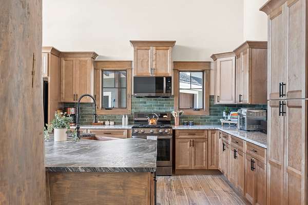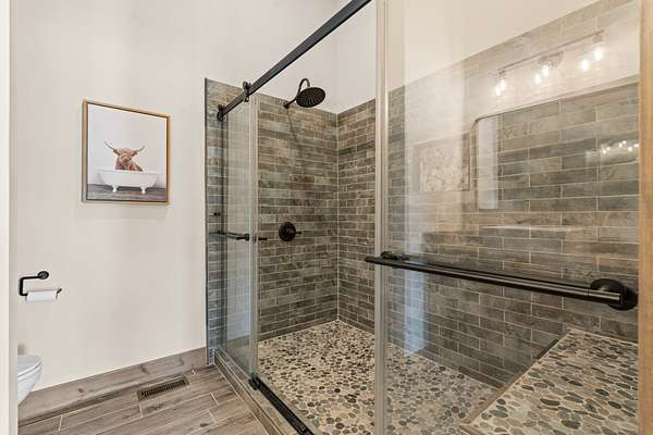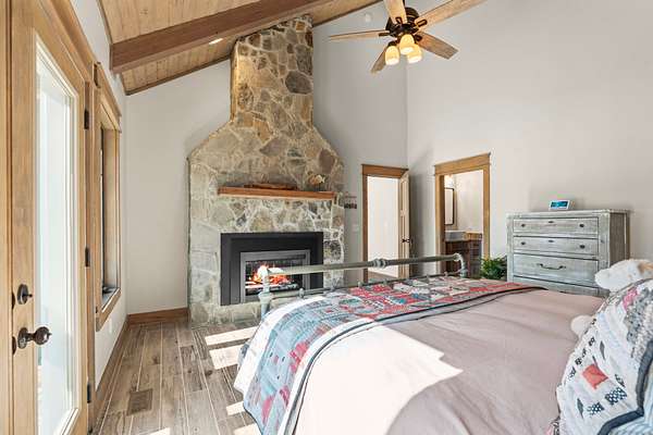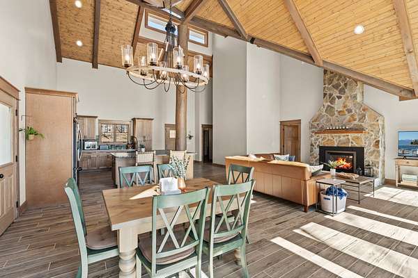 Step inside to a welcoming living room featuring soaring ceilings with natural wood beams and a striking stone fireplace that seamlessly connects to the master bedroom, creating a cozy yet luxurious ambiance. Beautiful wood-grain ceramic tile floors enhance the natural aesthetic while providing lake-proof durability. The thoughtfully designed floor plan is perfect for relaxing or entertaining, with every detail crafted to complement the natural beauty of the surroundings.
