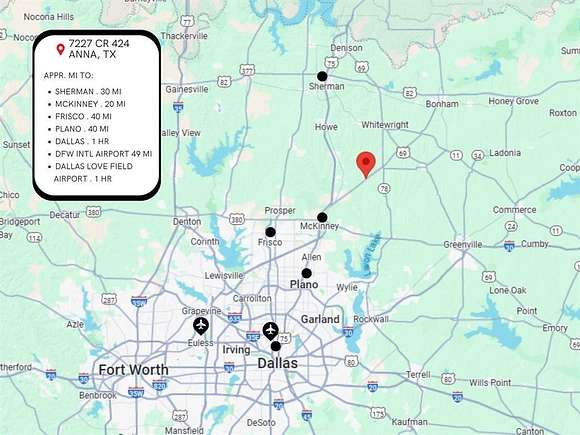 From N US Hwy 75, take Hwy 121 N toward Bonham. Turn L onto County Rd 424. Follow Co Rd 424 to the property on the R.