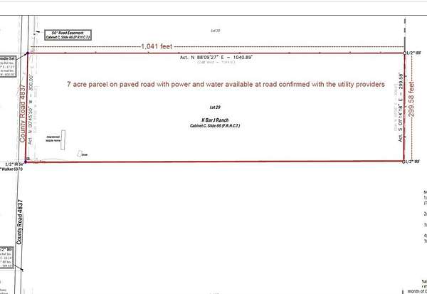 7 beautiful treed acres with water meter in place and power on property. The lot sits almost at the end of a dead end road and is very quiet and secluded. No road noise at all. Property is recently surveyed with all corners marked. Fenced on 2 sides. Pasture land behind. 300 feet of asphalt paved frontage. 1,041 feet deep lot. Electric is provided by TVEC. Water coop is Virginia Hill. 10 minutes to Hospital and Walmart and Chili's and many other restaurants and shopping. Country living with city amenities at its finest. Come build your dream home or bring your mobile or manufactured home. The area is booming with safari waters right next door. Will consider owner finance (13%) No prepayment penalty. Listing broker is owner. There is an old, very uninhabitable mobile home on the property and I am working on having it removed.